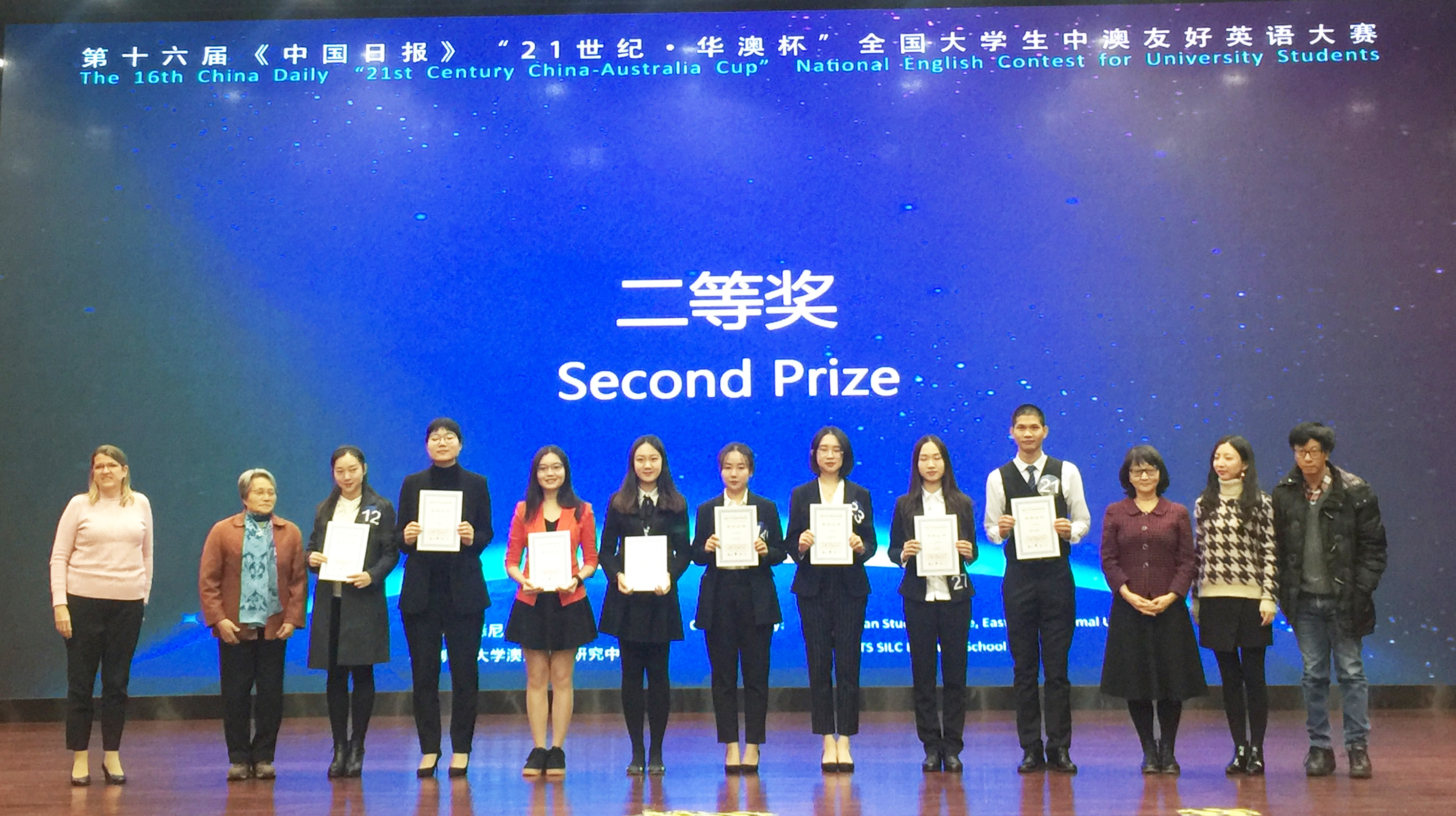 第十六届《中国日报》“21世纪•华澳杯”全国大学生中澳友好英语大赛12月15日在上海大学悉尼工商学院举行,我校艺术学院何魏同学在外国语学院杨卉老师的指导下,以优异表现获得二等奖。杨卉老师获得“优秀指导老师”奖。