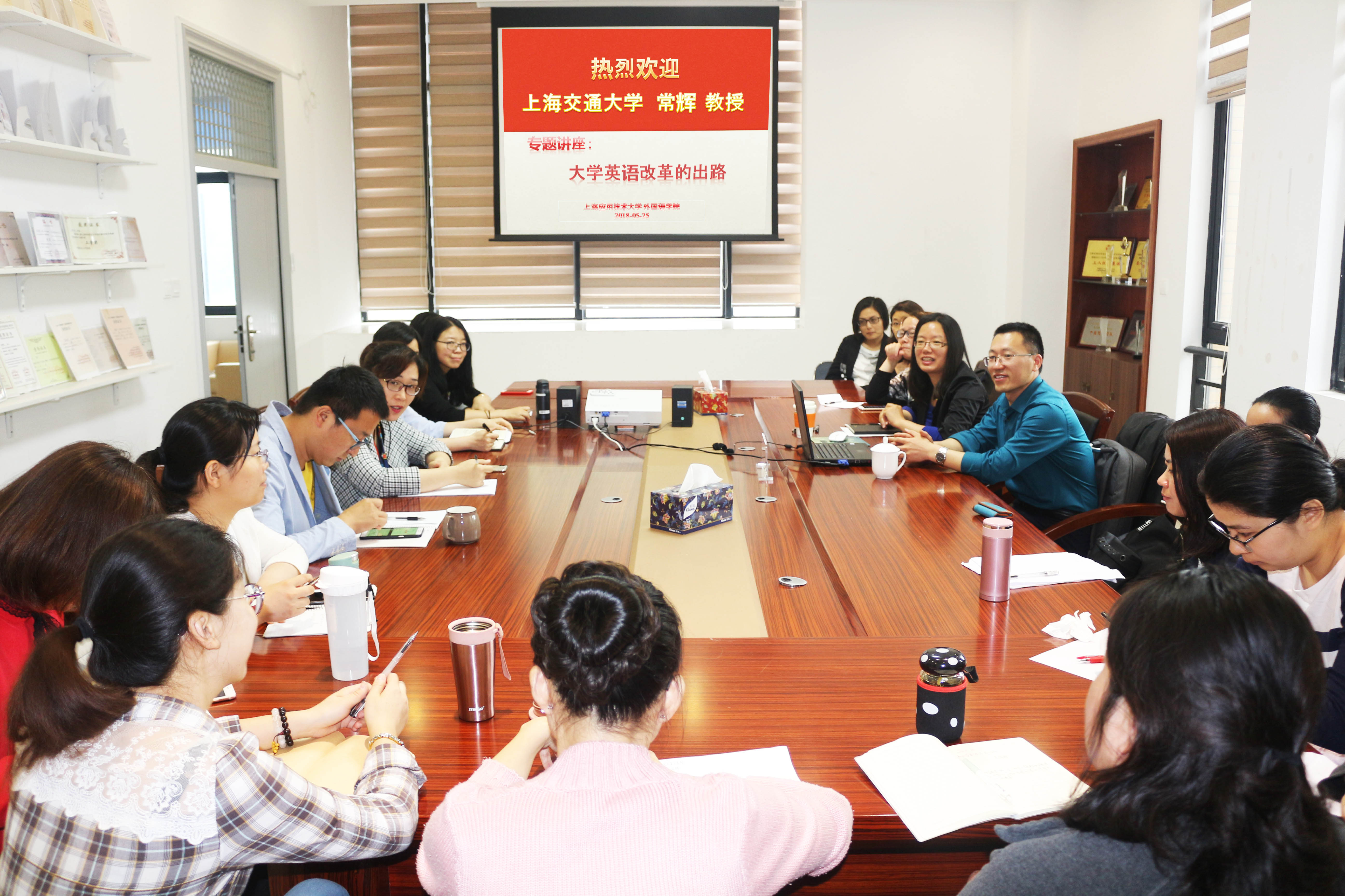 525日,上海交通大学博士生导师常辉教授应学院邀请做“大学英语改革出路”的专题讲座。讲座由副院长孙志青主持,大学英语教研部主任及二十多位大学英语课程负责人及骨干教师参加讲座。常辉教授首先回顾我国近20年的大学英语改革,总结其根本问题;然后提出大学英语改革需要构建大学英语系统,并详细阐述该系统的三大要素“学”、“教”、“测”之间的关系,接着以上海交通大学的大学英语改革实践为例阐释如何构建大学英语系统;最后讲述大学英语改革还需努力的工作。在座教师认真聆听,并与常教授就分级教学、水平测试、一体化教学平台等方面进行了交流讨论,受益匪浅。讲座历时两个半小时,信息量大,内容务实,应用性极强,对深化我校大学英语教学改革具有很高的指导性作用。