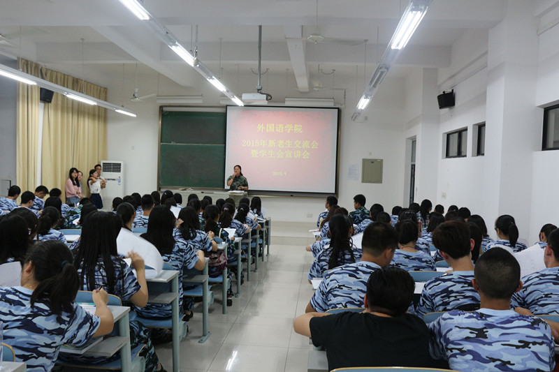 97日晚,外国语学院于一教B105召开新老生交流会暨学生会宣讲会,15级全体新生以及学生会部长级、主席团参加此次交流活动,新生辅导员卫琳琳出席本次交流会,活动由学生会主席万彬滢主持。