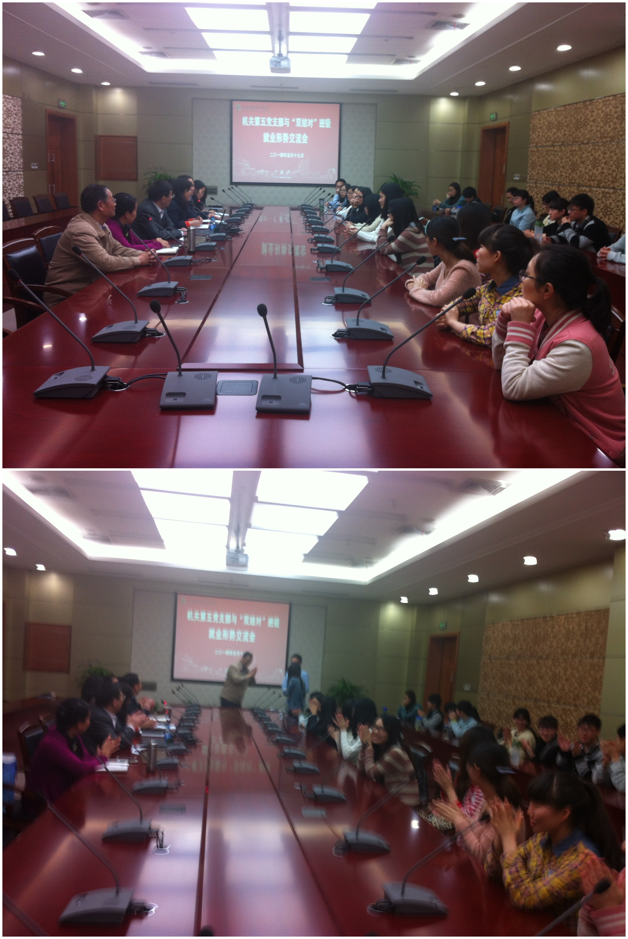 2014519上午,机关第五党支部(党办、纪委)与“双结对”班级学生召开座谈会,邀请学生处副处长翁德明作辅导报告,围绕大学生就业形势与技巧进行了深入互动交流。党委办公室主任杨明主持交流座谈会,外国语学院党总支书记张淑梅到会讲话,机关党总支谢常川同志向班级捐赠了自己获得的2012年度“忠诠—尔纯”思想政治教育奖三等奖奖金。党办、纪委全体党员,外国语学院相关教师及德语11111211班全体同学参加座谈会。