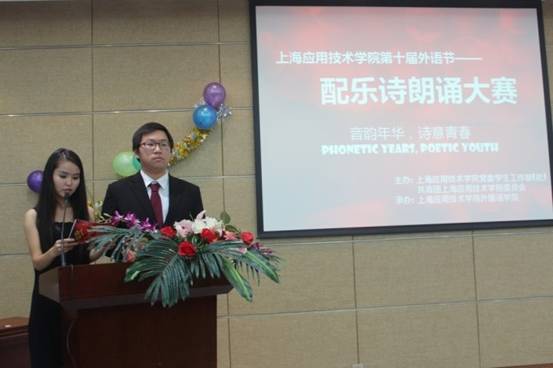 2013125日星期四晚18:00,上海应用技术学院外语节之音韵年华,诗意青春配乐诗朗诵大赛在奉贤校区图书馆B101举办。评审团有幸邀请了英语系教授钟玲老师、英语教学部副教授王志英老师、外国语学院辅导员刘从文老师。全校各学院的12组选手参加比赛,为观众们展现了一场听觉盛宴。