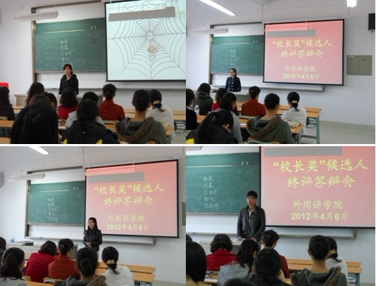 在“校长奖”评选前期,外国语学院本着公平、公正、公开的原则,通过飞信通知、邮箱发布、微博公布等形式,让全院学生及时了解校长奖评选活动的精神和动态。经过个人申报、班级投票、评委会审核讨论产生了5名候选人,最后5名候选人参加答辩会。每名候选人进行3分钟的自我陈述,并接受评委老师的提问。答辩结束后,进行了现场公开投票,最终确定了范春群同学为外国语学院校长奖候选人。