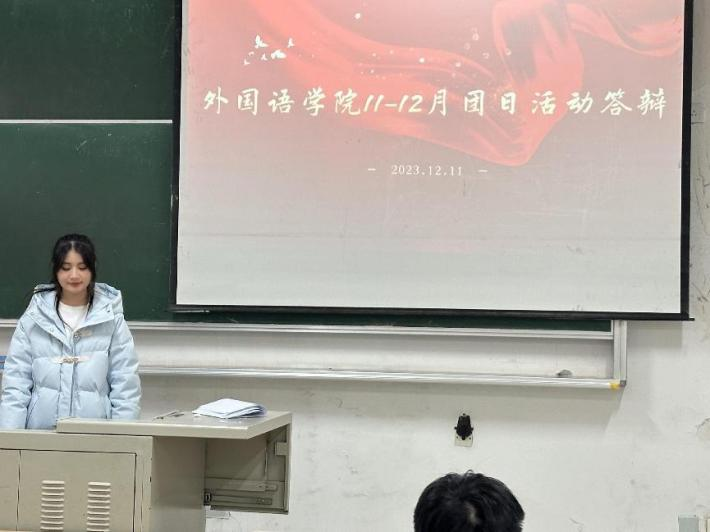 12月11日周一晚18点,外国语学院开展了11-12月团日活动答辩。在此次的答辩活动中,担任答辩活动评委的是外国语学院团委副书记周智晔、外国语学院组织部负责人刘东怡。