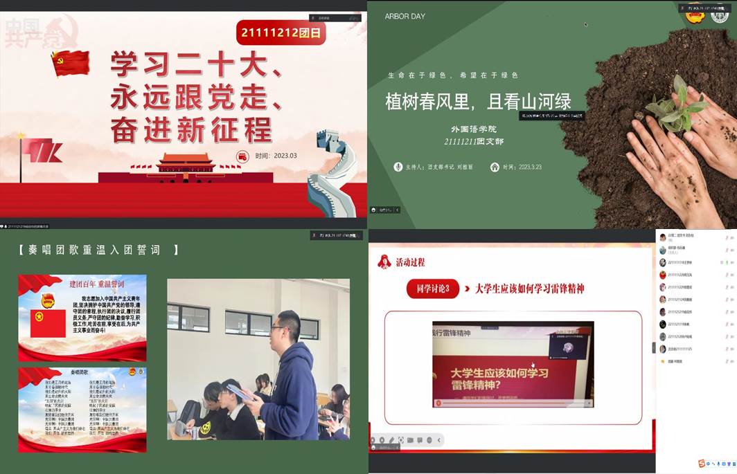 此次团日活动主要围绕“学习二十大、永远跟党走、奋进新征程”、“新时代的伟大成就”、“弘扬雷锋精神,淬炼责任担当”、“植树春风里,且看山河绿”、“守护权益,诚信为本”等主题开展,团支书根据自己班级开展的团日活动依次进行答辩。