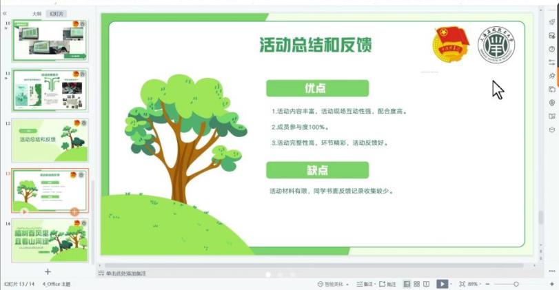 在答辩过程中,团支书们通过PPT的形式展示了本班团日活动的情况,并且对班内团日活动的完成率和同学们的积极性作出评价。评委对每一位团支书的答辩展示进行了认真提问和评价,并且对于团支书们答辩过程中出现的问题提出修改建议。