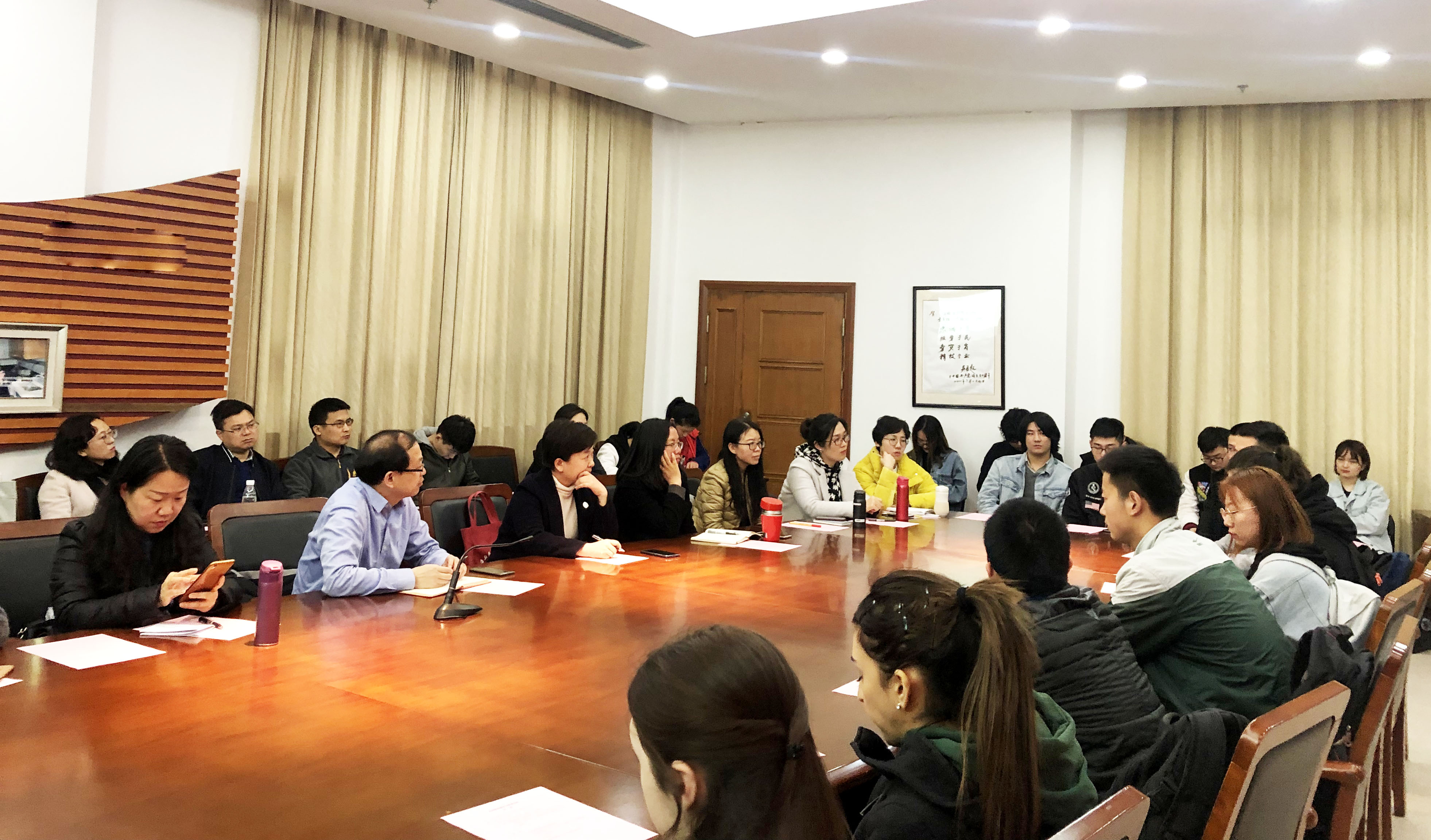 院长陈家旭首先阐明了此次座谈会的重要意义,要求学生们在大学期间要把主要精力放在学习上,学会利用记忆的规律学习语言,并结合自身经历与学生进行了互动。