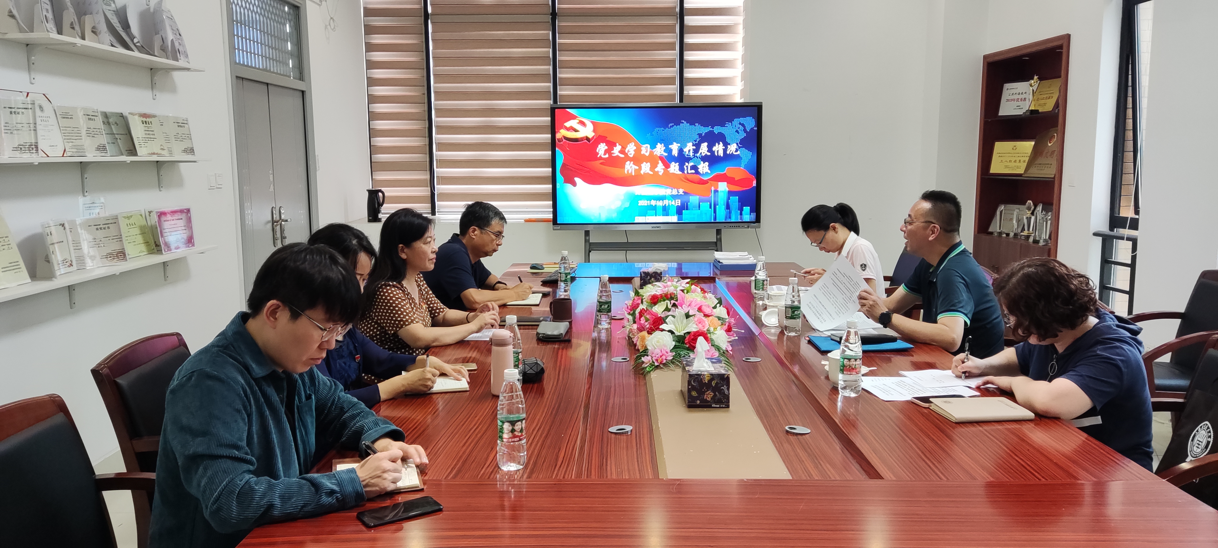 李晓晶重点从党史学习教育总体开展情况,“任务清单表”完成情况,党史学习第二阶段重点工作开展情况和工作亮点以及开展党史学习教育过程中存在不足与打算等方面做整体通报。