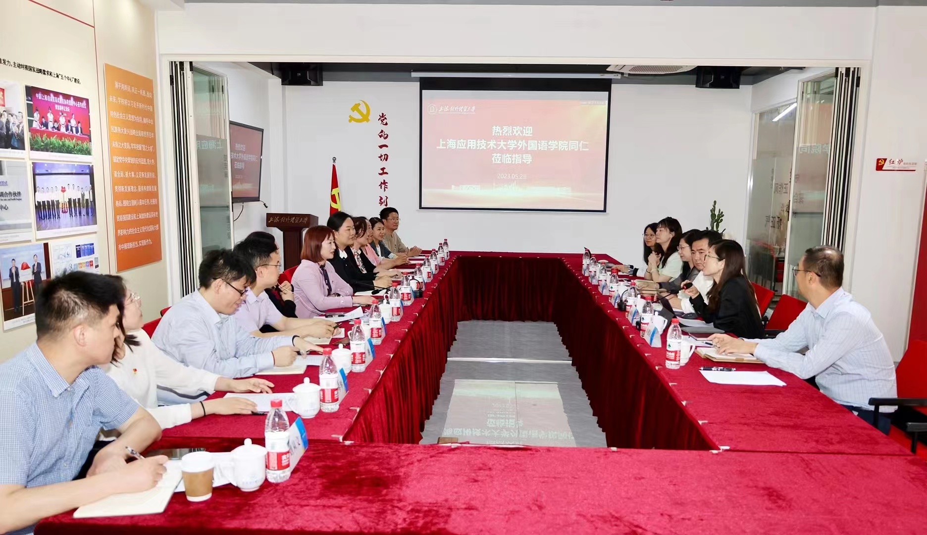 上午,学院院长潘智丹、党总支书记杨雪一行参观了上海外国语大学新时代上海高校党建创新基地暨校党群服务中心,中心负责老师盛攀峰对上外近几年党建的成果进行详细深入的介绍。随后,上海外国语大学英语学院院长王欣、党委书记杨雪莲、党委副书记、副院长曹原、副院长孙会军、德语系教工党支部书记魏琳璐等出席座谈会,双方围绕党建思政工作创新、专业设置和人才培养、学科建设及专业特色建设、课程思政建设、学科团队建设学院管理体系、人文教改与三全育人、学院文化品牌创建等方面深入研讨交流。