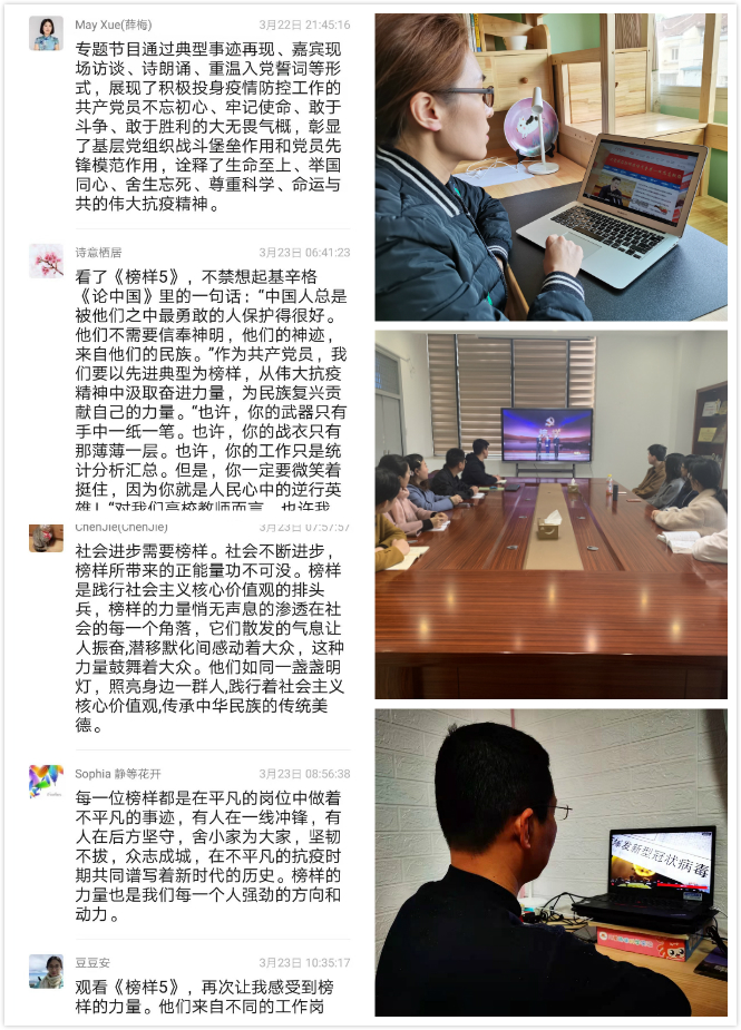 为学习先进典型榜样,领会“抗疫”精神内涵,3月23日,24日,外国语学院师生党员通过在家观看和集中观看的方式,学习了由中央组织部和中央广播电视总台联合录制的《榜样5》专题节目。