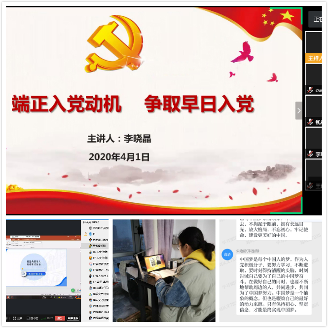 我院党总支书记李晓晶以《端正入党动机,争取早日入党》为题,围绕“党的成立及其光辉历程,党的性质和根本宗旨,如何以实际行动争取早日入党以及十九大对党员提出的新要求”等四个方面,结合案例,深入浅出、形象生动地进行分享讲解。李老师强调,党员并不是一种称呼,而是一种奉献和牺牲,加入中国共产党要遵守党规党纪,作为青年学生,要把握大势、要有担当、要踏实肯干,深刻领会习近平总书记系列讲话精神,不但要在思想上入党,更要在实际行动上入党。我院党员教师李锐以《回望西南联大,勇担时代使命》为题,通过一段段生动感人的故事,为学员们展示了爱国知识分子们在特殊年代的爱国情怀。本次培训还安排了《党史故事100讲》、《十九大党章公开课》、《时代楷模—张富清“95岁老党员的初心本色”》等专题党课,帮助学员加强党的理论基础、提高党性修养。为严格管理学员、确保教学质量,分党校根据教学内容还安排了四次线上讨论,小组长担任“线上”督学,负责学员管理,确保学员培训期间有所收获。