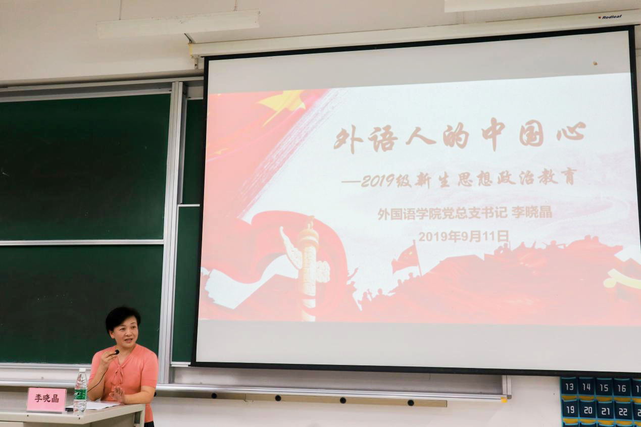 9月11日晚,学院党总支书记李晓晶以“外语人的中国心”为题,为2019级全体新生上了一堂生动的思想政治教育入党启蒙教育课。