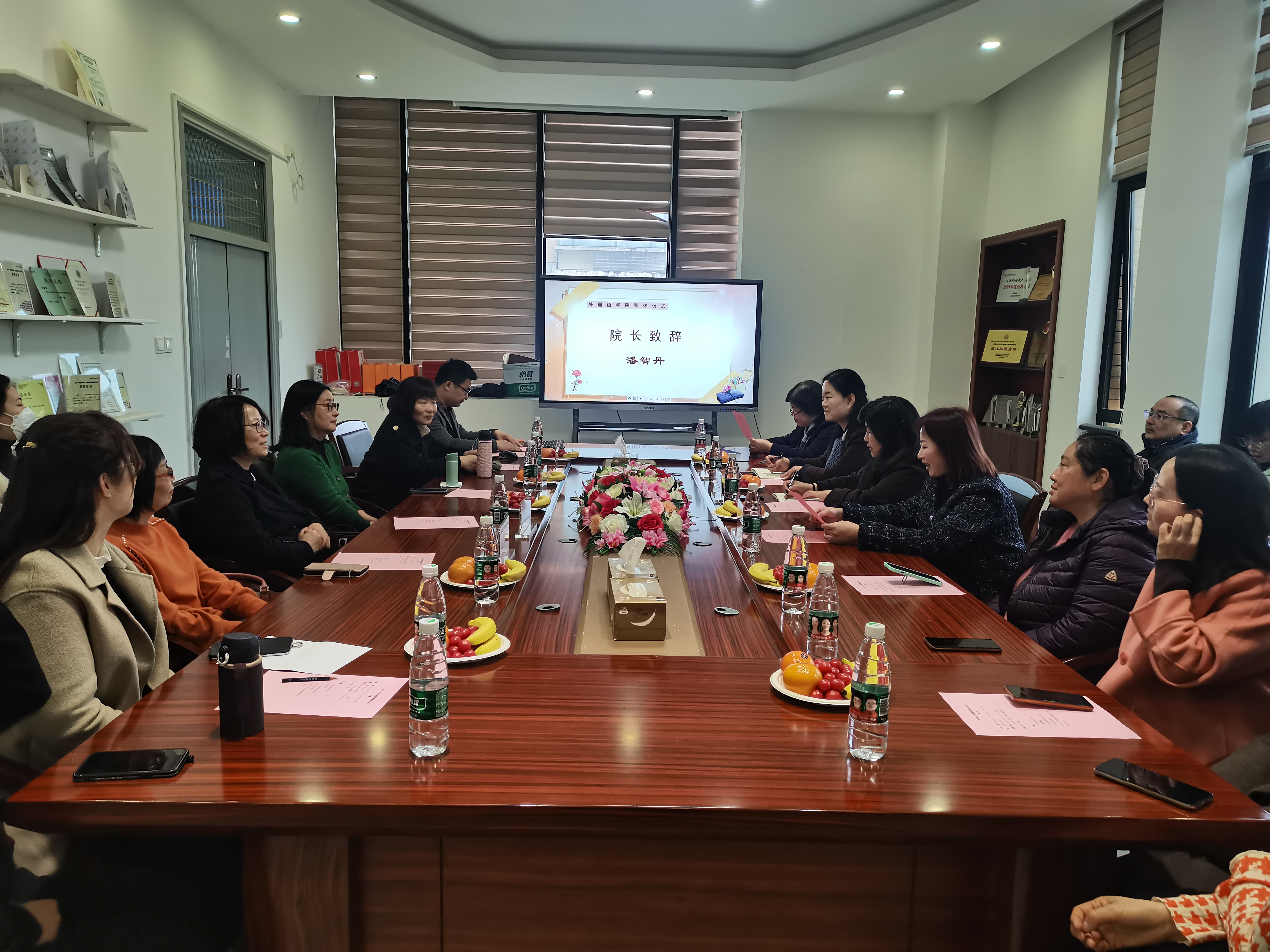 为感谢退休教师对教育事业所做出的贡献,3月17日,外国语学院为汪珉、许向群、缪素琴及毛瑞红等四位老师举行了荣休仪式。校工会常务副主席张淑梅出席并讲话,院长潘智丹、书记杨雪及部分教师代表30余人共同参与。
