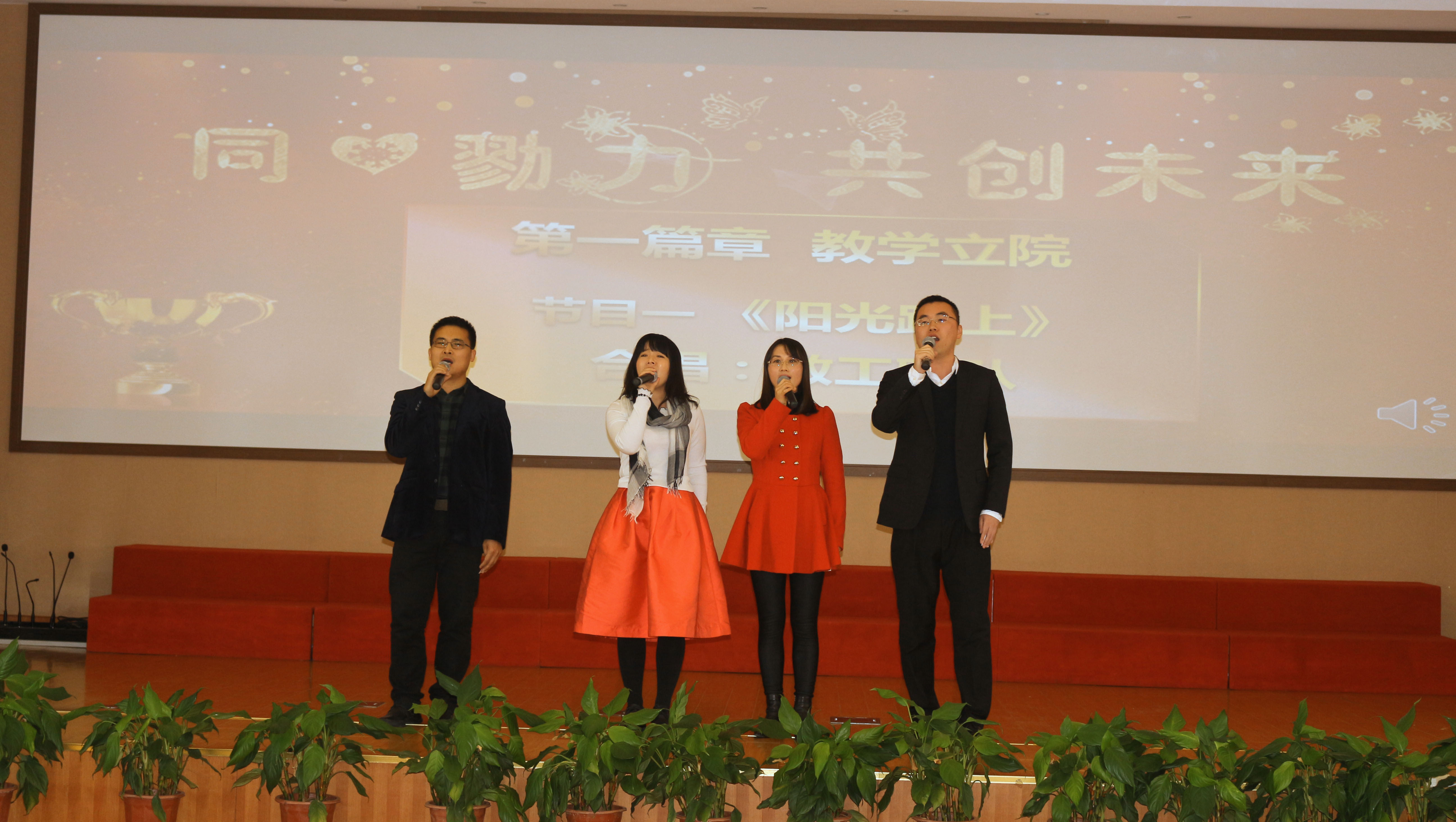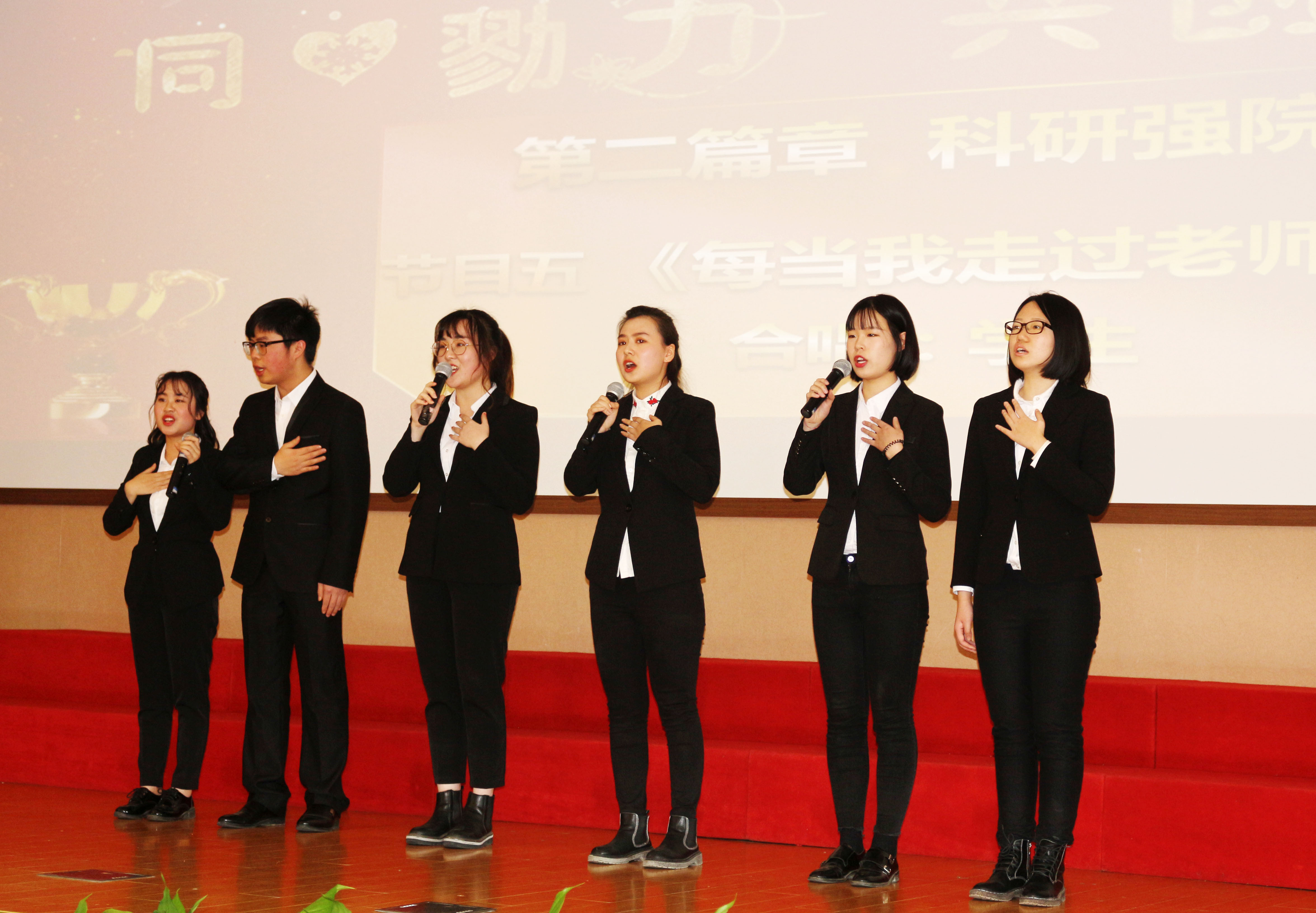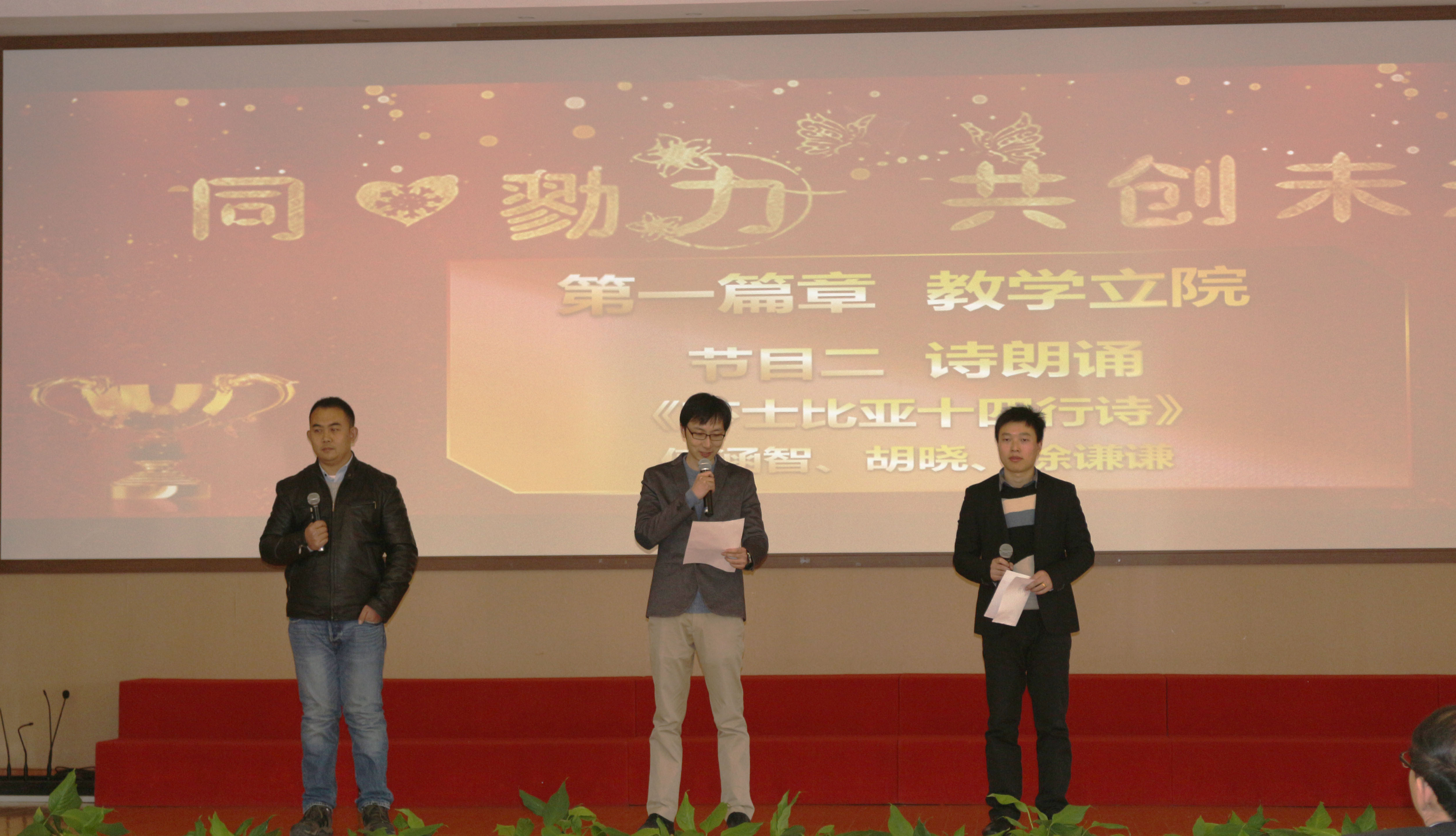此次活动,共分“教学立院”、“科研强院”、“和谐兴院”三个篇章,分别对2017年度在教学、竞赛、科研、学生工作、党的建设以及精神文明建设等方面取得优异成绩的教师进行表彰,其间穿插教师们表演的诗朗诵、歌曲、舞蹈等节目,如大学英语教研室教师英文朗诵《莎士比亚十四行诗》、德语系教师德文演唱《欢乐颂》,胡燕老师的古典舞《敦煌》等。一个个节目精彩纷呈,会场上大家由衷的欢笑声此起彼伏,一次次热烈的掌声经久不息。最后,联谊会在全体人员同唱《走进新时代》的歌声中落下帷幕。