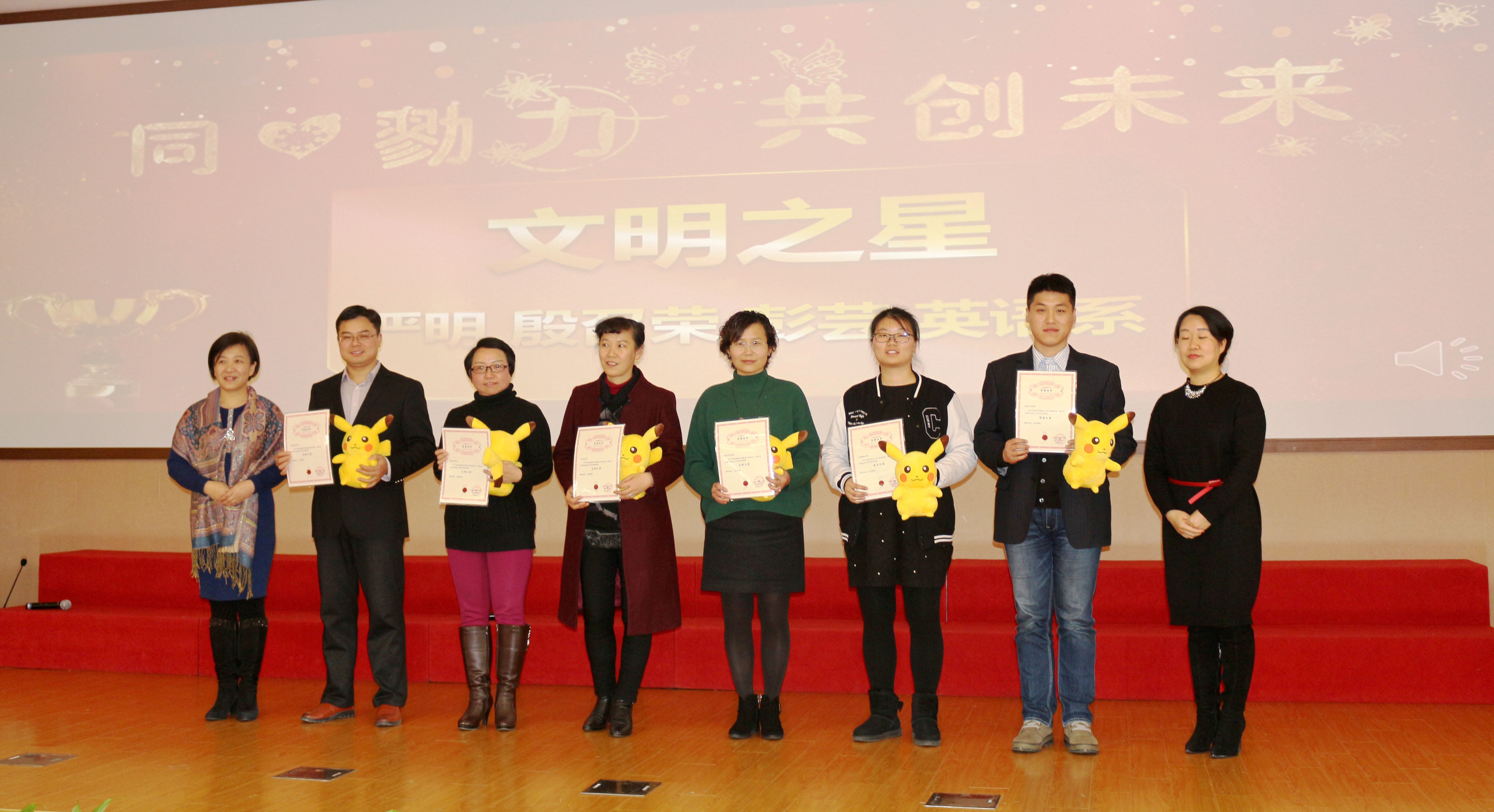 1月11日,外国语学院举行教师表彰暨迎新联谊会。本次联谊会以“同心勠力 共创未来”为主题,对在2017年度学院各项工作中表现突出的教师进行了表彰。校工会常务副主席张淑梅应邀出席,外国语学全体教师参加,部分教师表演了精彩的文艺节目。