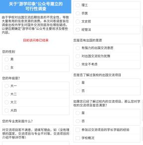 该项目进行过程中,调研的主要形式为网络问卷,在前期调查同学们对公众号功能的需求;收集信息的主要方式为一对一采访外国语学院参加及曾参加过出国交流项目的学生,并将所得信息整合为文字和图片进行存档;项目成型后,公众号定时推文,所推文章的主要内容为学生们出国交流的心得体会、前期出国交流的准备、到达后的注意事项、学校的基本情况、游学的体验和当地国家的文化等。目前已推送4篇,涉及的学校有德国不来梅大学、欧福大学、特里尔大学等知名高校。