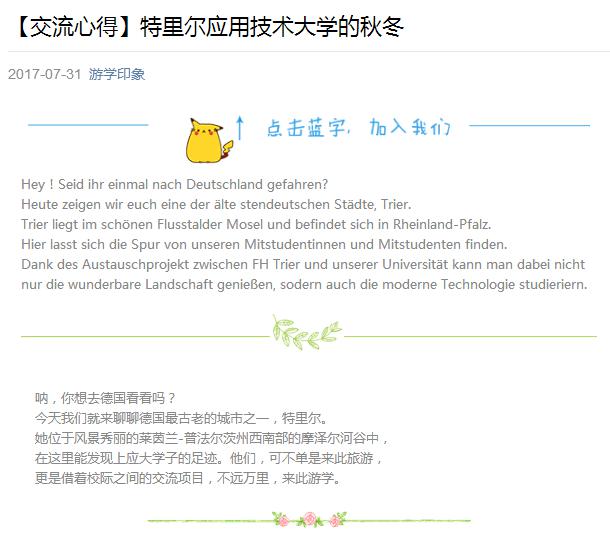 2017年7月31日晚10点41分,外国语学院暑期社会实践团队“游学小分队”的项目——“游学印象”发送了第一篇正式推文“【交流心得】特里尔应用技术大学的秋冬”。】