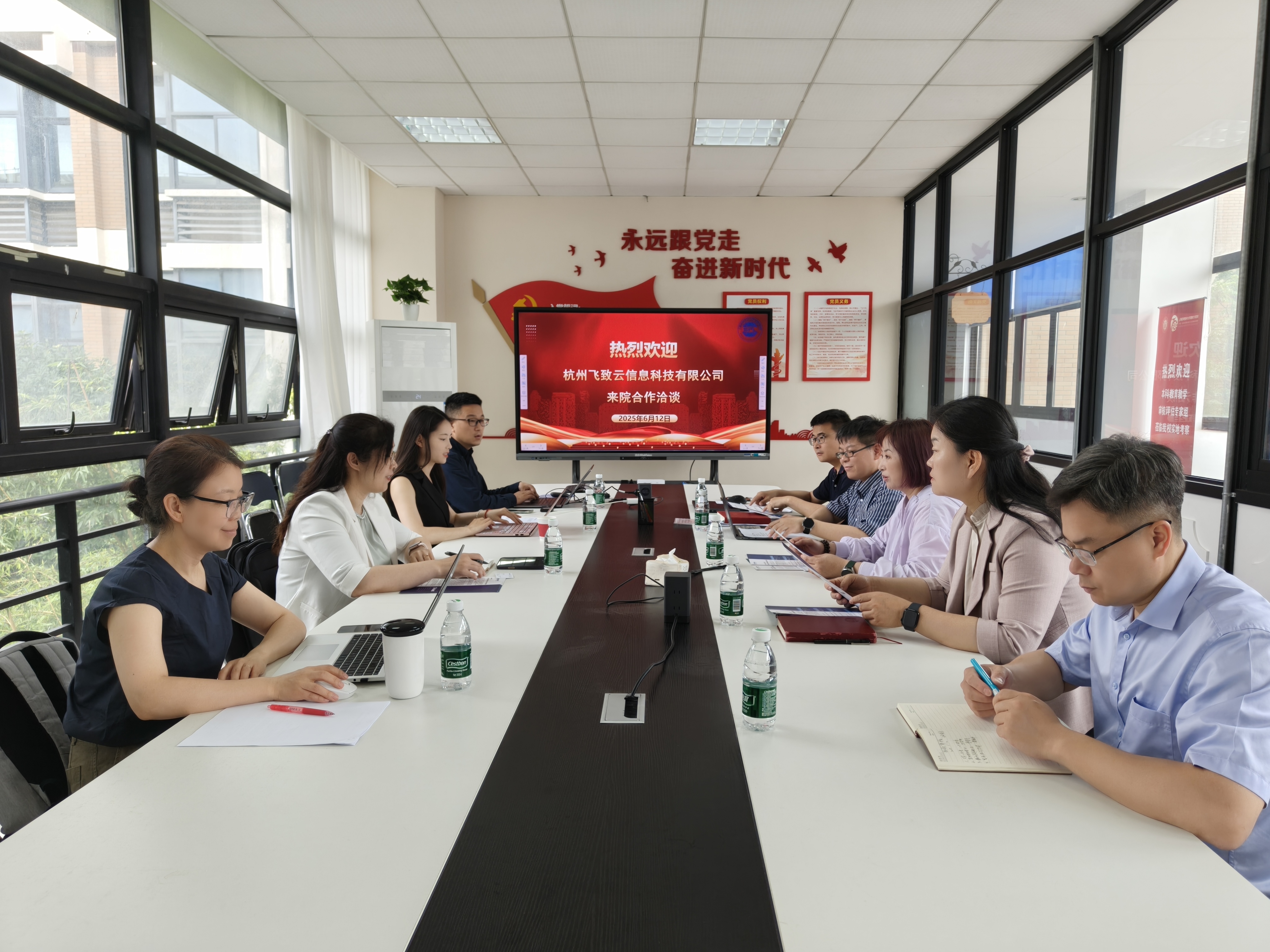 6月12日上午,杭州飞致云信息科技有限公司代表一行携其AI开发与应用最新成果,与外国语学院院长潘智丹、党委书记杨雪、副院长叶湘、迟娟、应用英语系和大学英语教研室主任、实验室负责人进行了深入的合作洽谈。