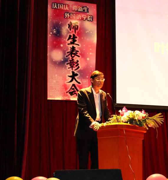 为总结和弘扬先进事迹,进一步激发师生为学校发展贡献力量的热情,10月10日,外国语学院以“庆国庆 迎新生”为主题举行了一场师生表彰大会,对上一年度学院广大师生中涌现出的先进团体和个人进行了表彰。副校长叶银忠出席大会并发表讲话,外国语学院全体领导、教师和一二年级学生参加。