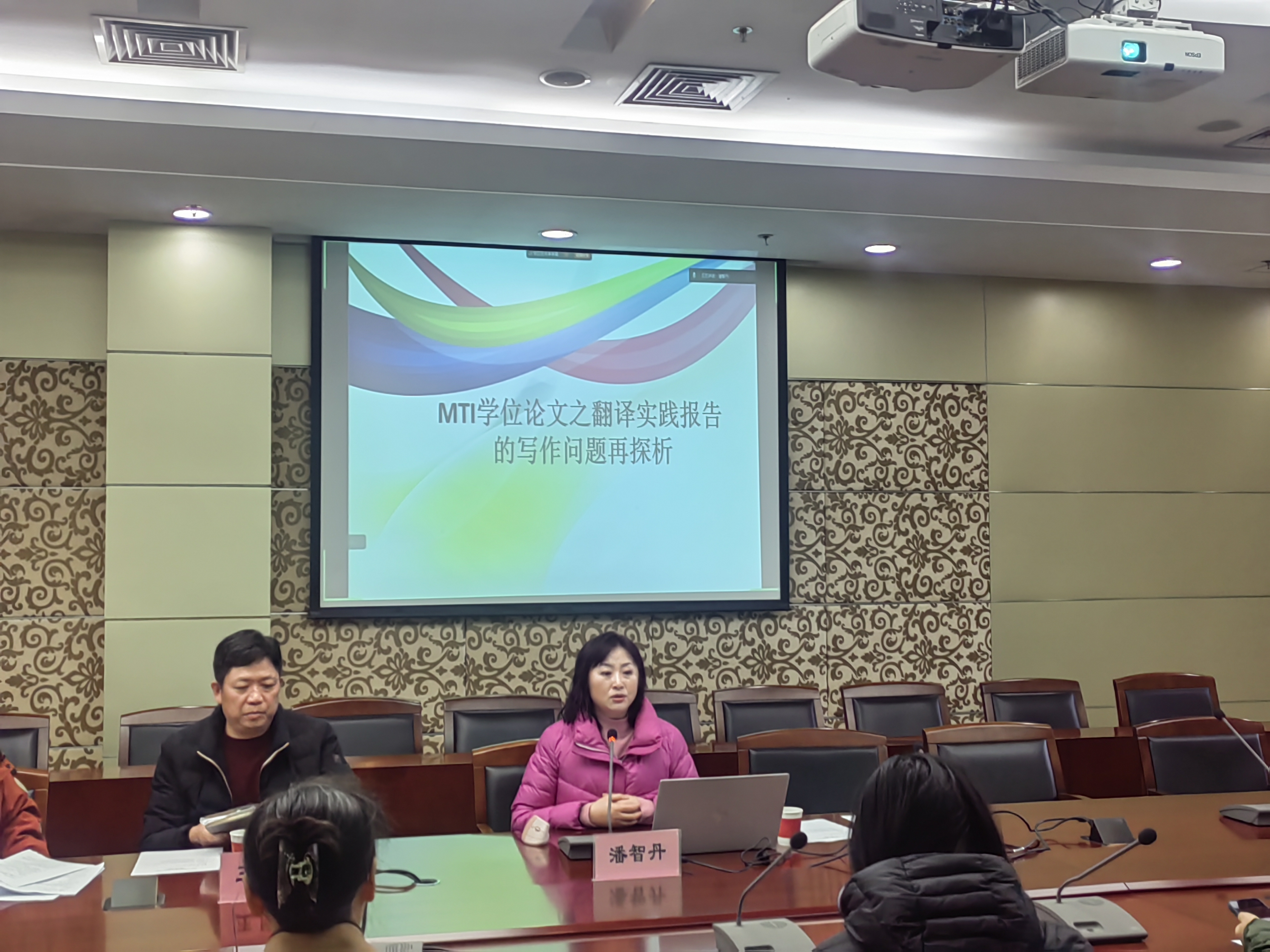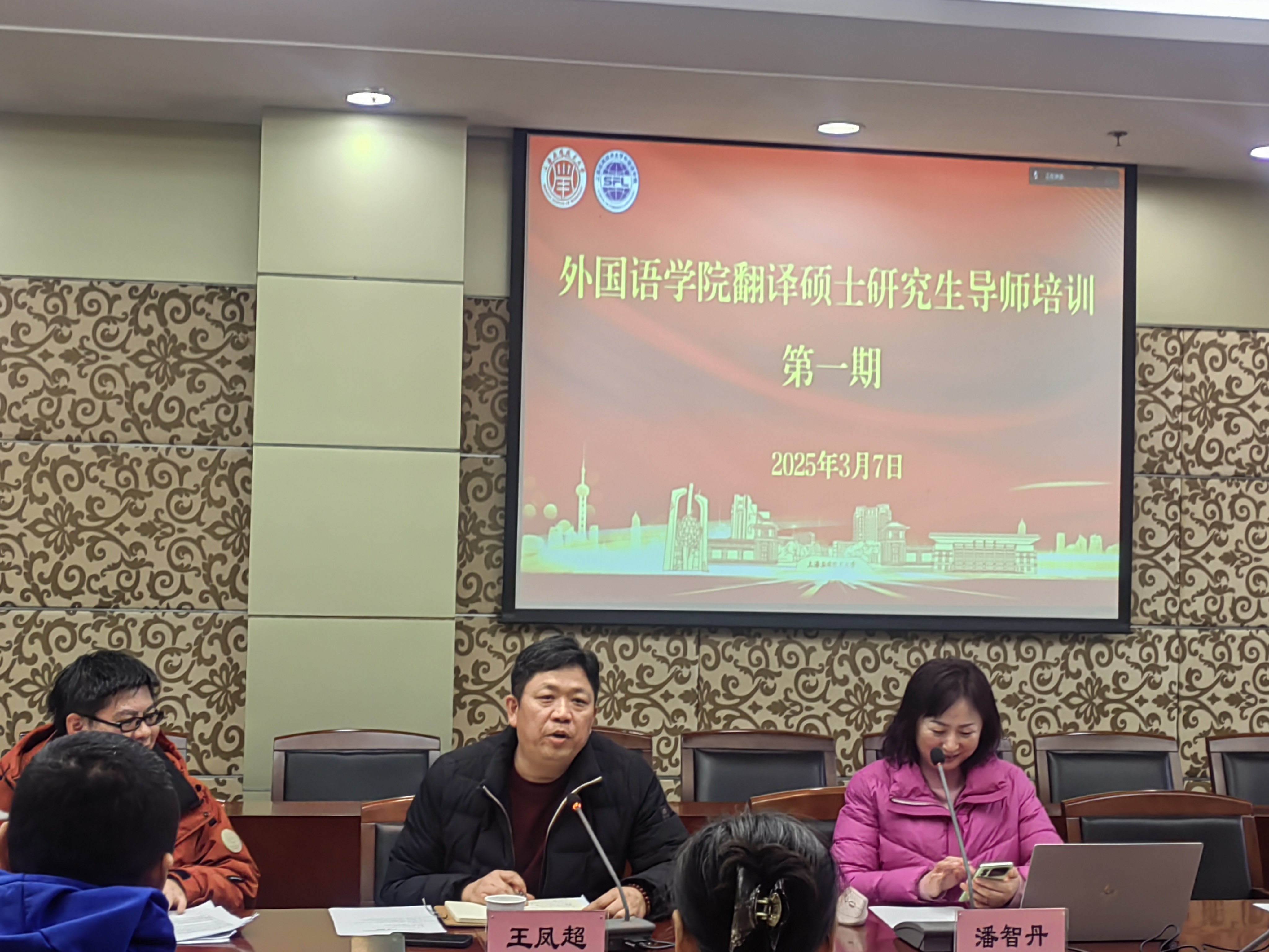 为提升翻译硕士研究生导师的指导水平,进一步优化研究生培养质量,外国语学院于3月7日在奉贤校区图书馆B103会议室举办翻译硕士研究生导师系列培训第一讲。研究生院副院长王凤超出席,外国语学院全体硕士生导师及自主报名的教师参加。培训第一讲由外国语学院党委副书记、院长潘智丹主讲。培训会由学院副院长叶湘主持。