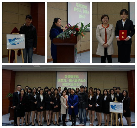 开场视频带大家回忆了外国语学院团总支、第六届学生会组建以来的点点滴滴,回顾了大家共同努力得来的成绩。随后进行了学生干部的聘任仪式。学生干部代表发言后,外国语学院学生会logo正式揭晓。设计者对logo进行了解说,她希冀:外国语学院学生会日后能如同logo上的和平鸽一样展翅高飞。最后,副书记、副院长金丽华与大家分享了自己担任学生会干部的经验,同时对外国语学院学生会成员提出了三点建议:1.掌控时间,努力学习。2.学会思考,掌控情绪。3.调适心态,悦纳自己。