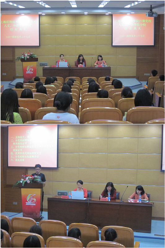 5月27日,上海应用技术学院第27期党校人文、外语分校结业典礼在图书馆B102举行。外国语学院党总支书记、分党校校长张淑梅,人文、思政联合党总支副书记(主持工作)、分党校校长韩磊,外语学院副书记、副院长、分党校副校长金丽华、分党校联络人以及全体学员出席大会。分党校副校长金丽华主持会议。