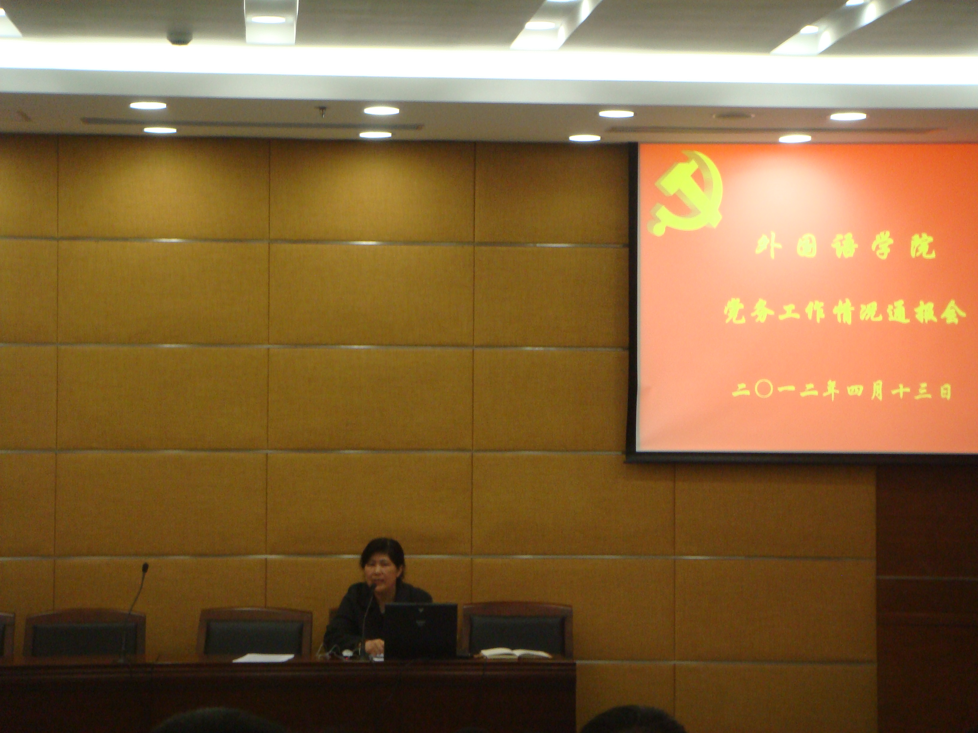 2012年4月13日下午,外国语学院在奉贤校区图文信息楼B102学习传达党风廉政建设和安全稳定工作会议精神。外国语学院全体教师参加会议。党总支负责人传达了相关会议精神。