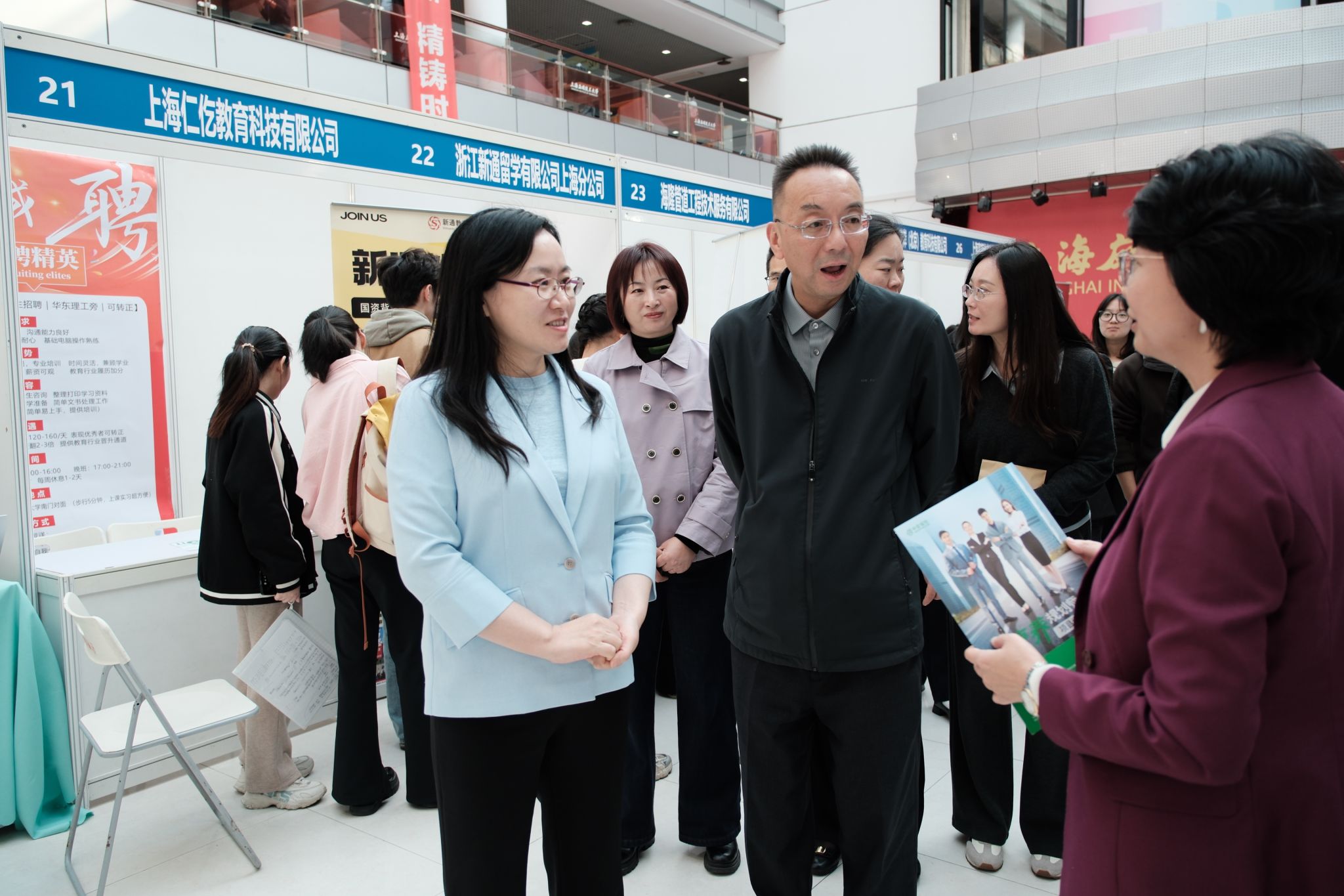 王瑛逐一走访了每一个参会企业展位,与用人单位代表进行了深入交流,详细了解行业发展现状,本次招聘的具体岗位需求以及对学校人才培养的反馈和建议。并对现场参与招聘的学生进行了亲切慰问,鼓励他们树立正确就业观,把握机遇,积极应聘。