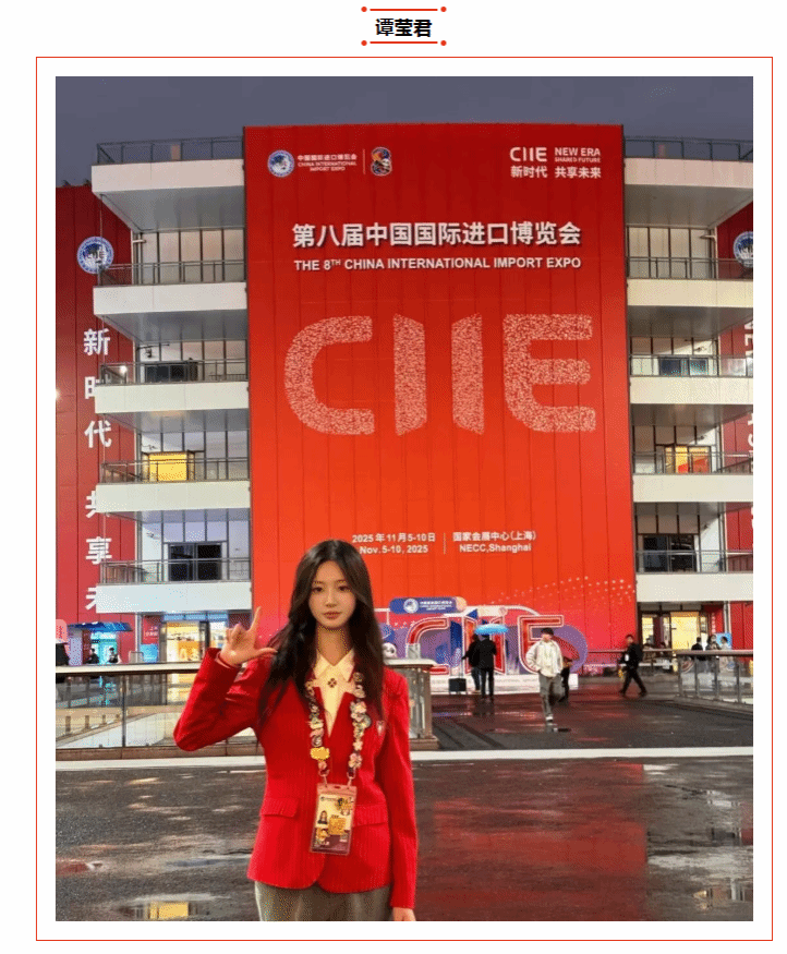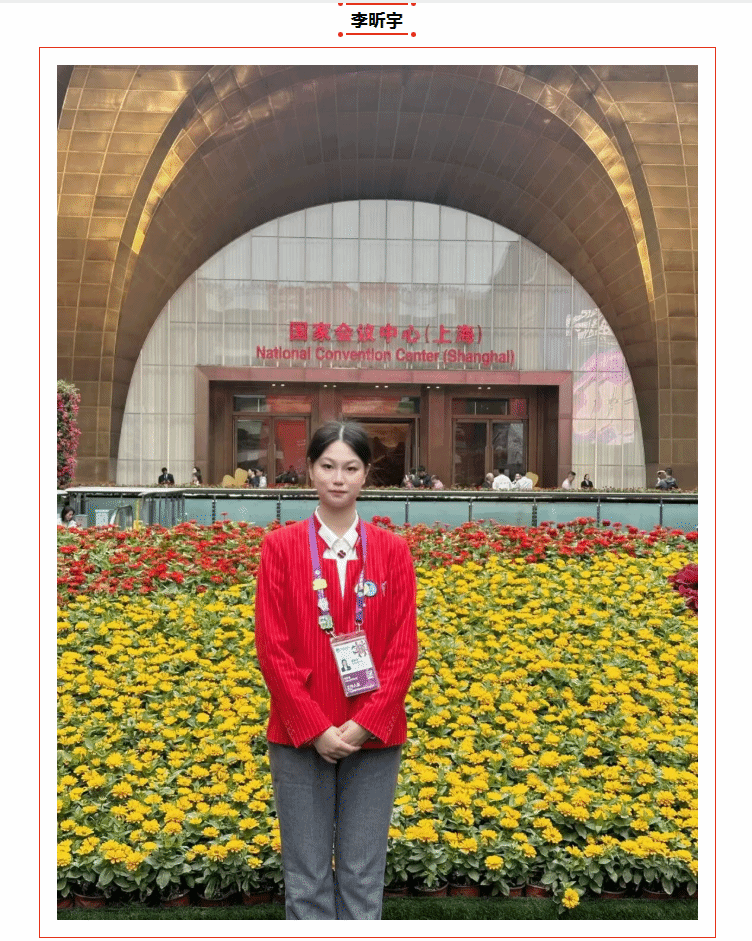 于我而言,进博会是课堂,也是舞台。它让我跳脱书本,亲眼见证全球化的脉动与国家发展的蓬勃,将个人成长与时代浪潮紧密相连。我用真诚的微笑与细致的服务,向世界传递中国的友善与温度;用严谨的态度守护信息畅通,诠释青年一代的责任与担当。我们将继续以奋斗为笔,在这片共享未来的广阔天地里,书写下无愧于时代的青春答卷。