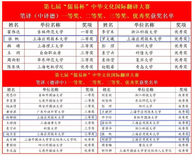 林郁骐、赵力霏获得笔译(德译中)全国三等奖,王婕妤、俞欣伶、张帆、郑丽莎获得笔译(德译中)全国优秀奖。