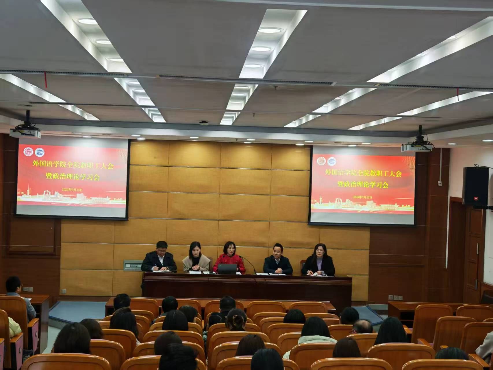 3月13日下午,外国语学院在图书馆B102会议室召开了新学期全院教职工大会暨政治理论学习会。学院领导班子成员、全体教职工参会,会议由院长潘智丹主持。
