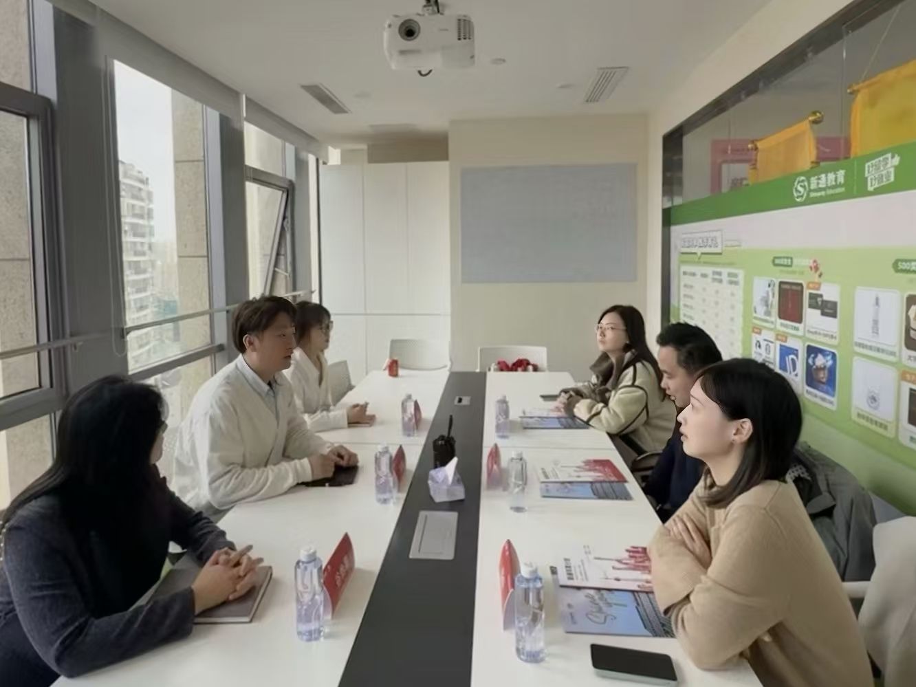 在实地参观了上海新通教育的教学场地、刷题机房、办公区域及文化展示区后,张帅介绍了集团发展历程、办学特色、业务体系、校企合作及岗位招聘等情况,表达了与学院在实习基地共建、人才培养优化、校企资源互通、共同打造适配行业需求的复合型外语人才培养新模式等方面开展更深入务实合作的意愿。谷怡霏结合当前留学趋势,分析了外语专业学生在国际教育领域的职业发展路径,分享了企业在市场拓展中对复合型外语人才的需求现状。
