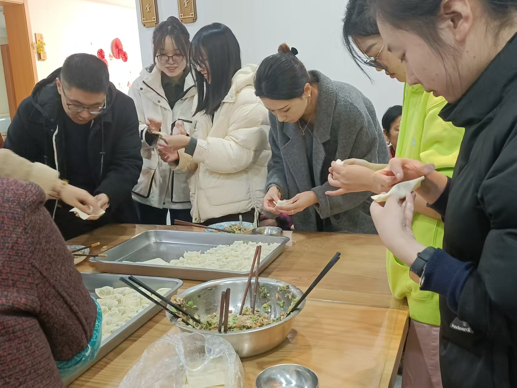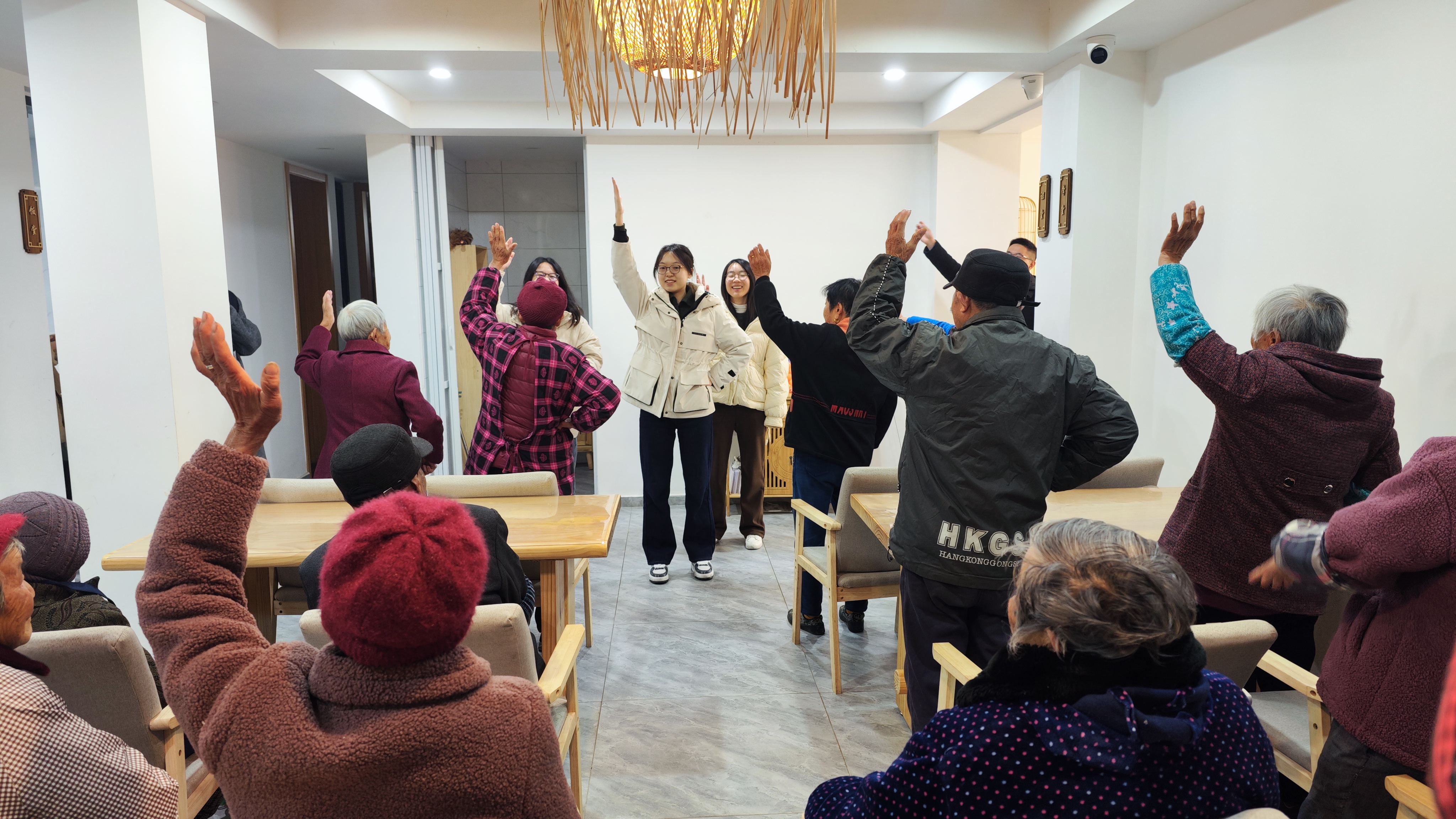 同学党员们分成两组,用不同的方式为村居老人们送上冬日的温暖。一组同学与基地人员共同为老人包馄饨,从洗菜、切菜、拌馅、包、煮、分全程参与,通过亲手劳作展现对老年人的关爱和尊重。一组同学带领老人们游戏互动,通过拍手操、“造反游戏”“乒乓球搬运”等趣味小游戏,温暖身体,锻炼大脑和身体反应能力。劳作的声音与游戏的欢声笑语混合在一起,奏响了一曲冬日和谐温暖的敬老赞歌。