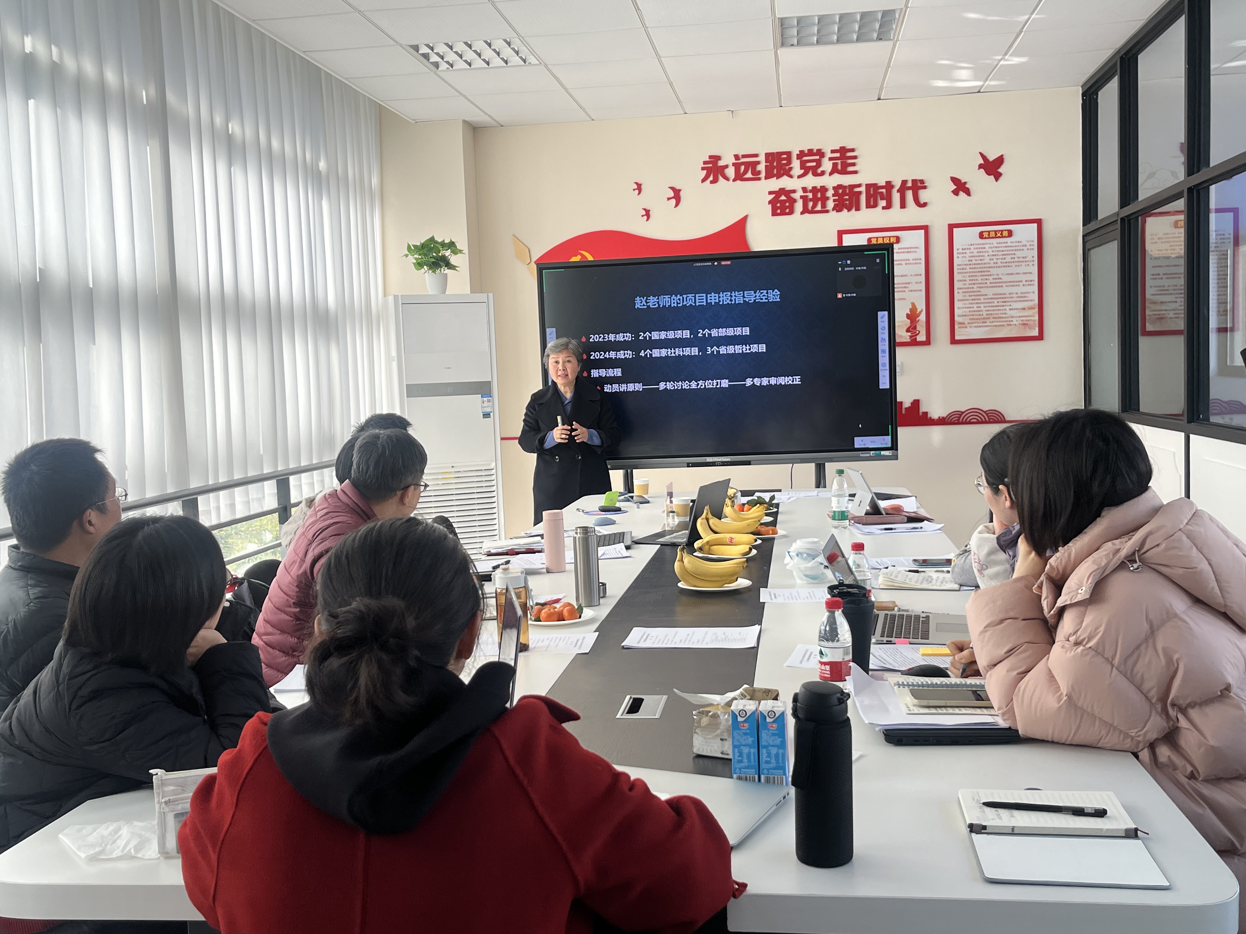 学院邀请了教育部哲社重大攻关项目首席专家、上海外国语大学赵蓉晖教授以及国家社科基金重大项目首席专家、南京大学杨金才教授作为点评专家进行一对一指导。点评会上半场,赵蓉晖教授带来了一场干货满满的国社基金申报讲座。她毫无保留地分享自己与团队多年积累的社科基金申报实战经验,从剖析好选题应具备的关键特质,到详解如何依据研究内容挑选最为契合的申报学科,再到传授开篇写作要点,以及强调申报材料写作务必避虚就实等诸多角度,为教师们拨开迷雾、指明方向。紧接着的一对一咨询点评环节更是精彩不断,面对4位语言学、翻译等研究方向教师递上的申报书,赵教授逐一精准“把脉”,仔细考量选题的合理性,深挖内容的创新性亮点,严格审视写作的细节,给每一位申报人极具针对性的专业意见。