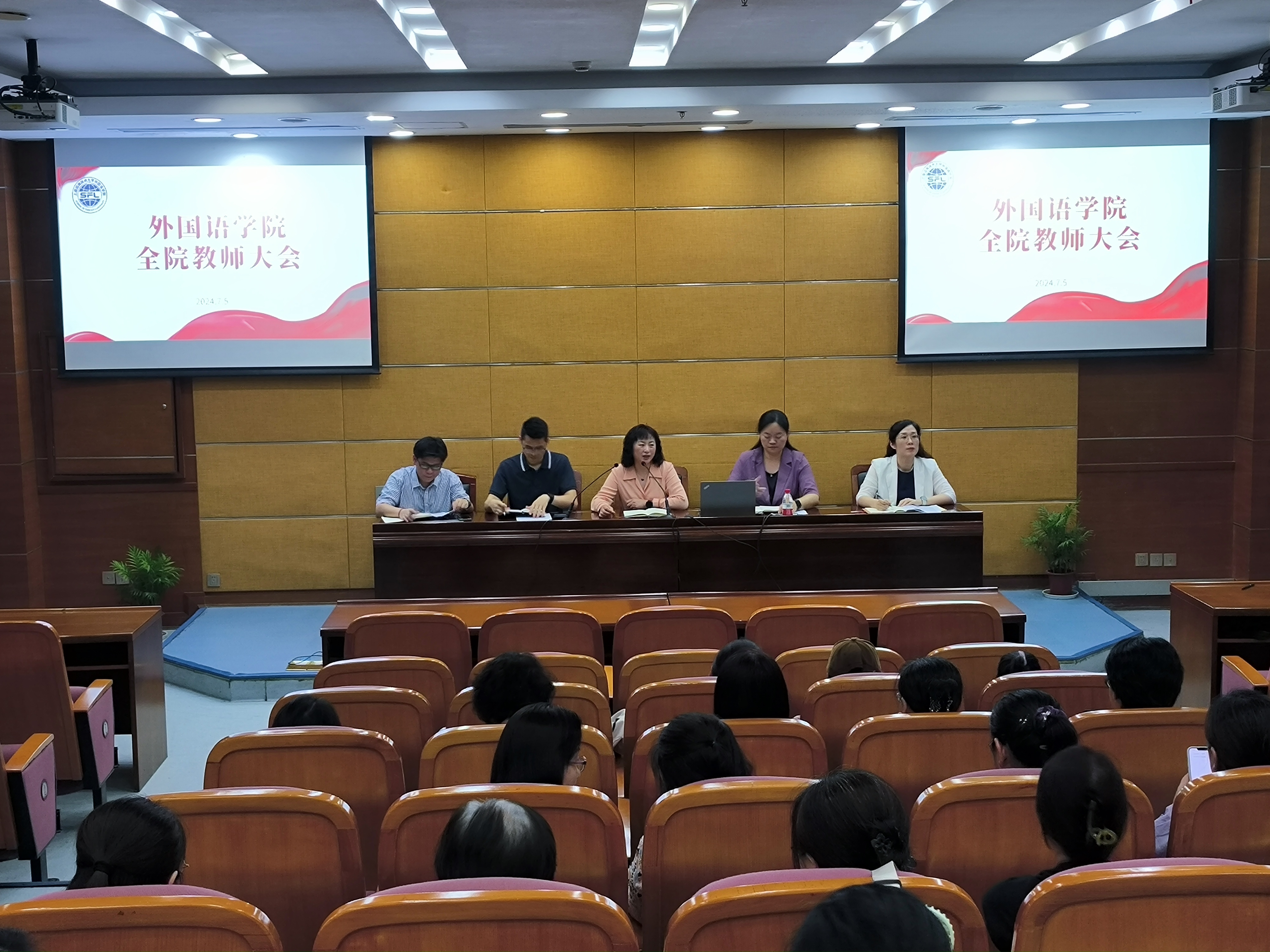 7月5日下午,外国语学院在图书馆B102会议室召开2024年春季学期期末全院教职工大会。学院领导班子成员、全体教职工参加会议。会议由学院党总支书记杨雪主持。
