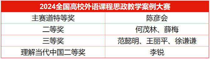 此外,学院陈彦会、何茂林、薛梅、李锐、范懿明、王丽平、徐谦谦7位优秀教师在2024全国高校外语课程思政教学案例大赛中斩获特等奖1项、二等奖3项、三等奖3项,充分体现了学校和学院课程思政工作的深入开展和扎实成效。七位老师分别依托《综合英语》《英语国家概况》《进阶通用英语》《理解当代中国·演讲课程》《学术阅读与翻译》《大学英语3C级》《翻译简史》教改课程的教学内容,紧扣学生切身经历、深挖思政内涵,凝练教学模式,融合数智技术,充分发挥外语课程铸魂育人功能,实现知识、能力与价值目标有机统一。学院一直把课程思政作为外语教学不可或缺的重要部分,为教师搭建有组织的教研平台,激发教师积极参与思政主题教学竞赛的热情和动力,讲好中国故事,传递中国声音。