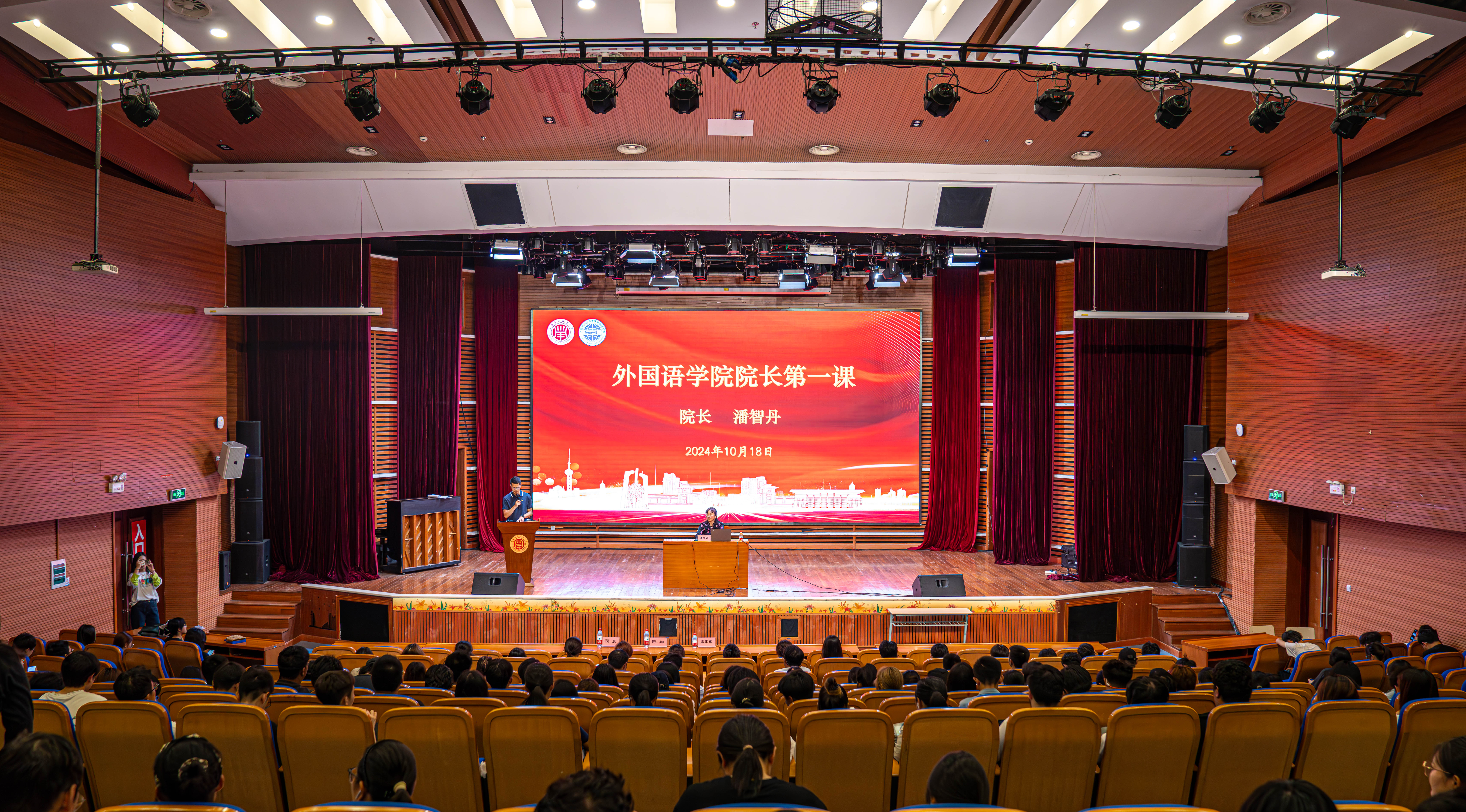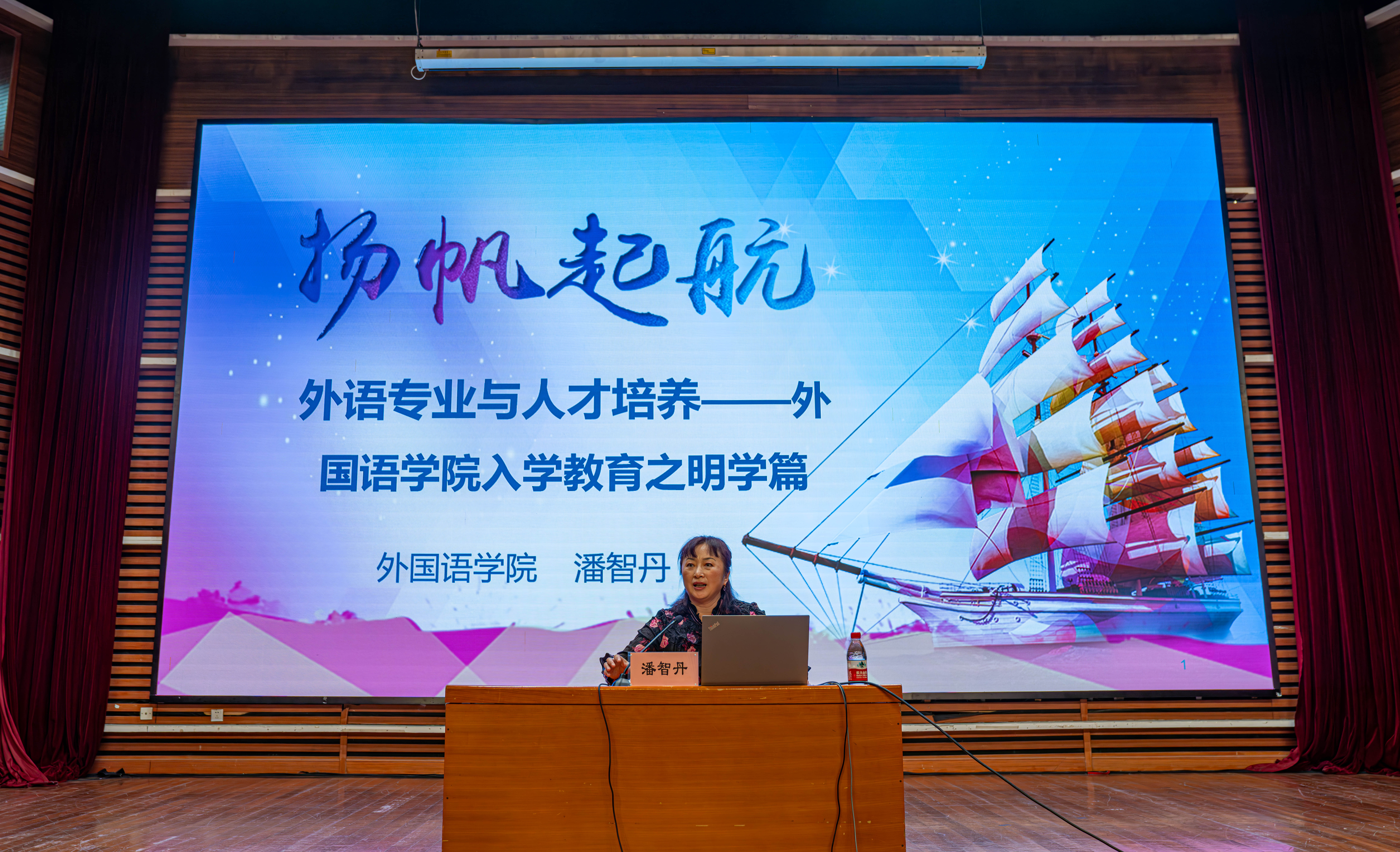 为切实提升2024级新生的专业归属感、认同感,增强专业自信和规划意识,了解专业发展方向,掌握前沿动态,10月18日下午13点,外国语学院在学生活动中心小礼堂开展2024级新生“院长第一课”暨外语节主题报告。学院院长潘智丹教授以“扬帆起航——外语专业与人才培养”为主题,为学院2024级全体新生进行精彩讲授。新生辅导员刘靖雯以及2024级全体新生参与活动,学院党委副书记、副院长周雄才主持讲座。