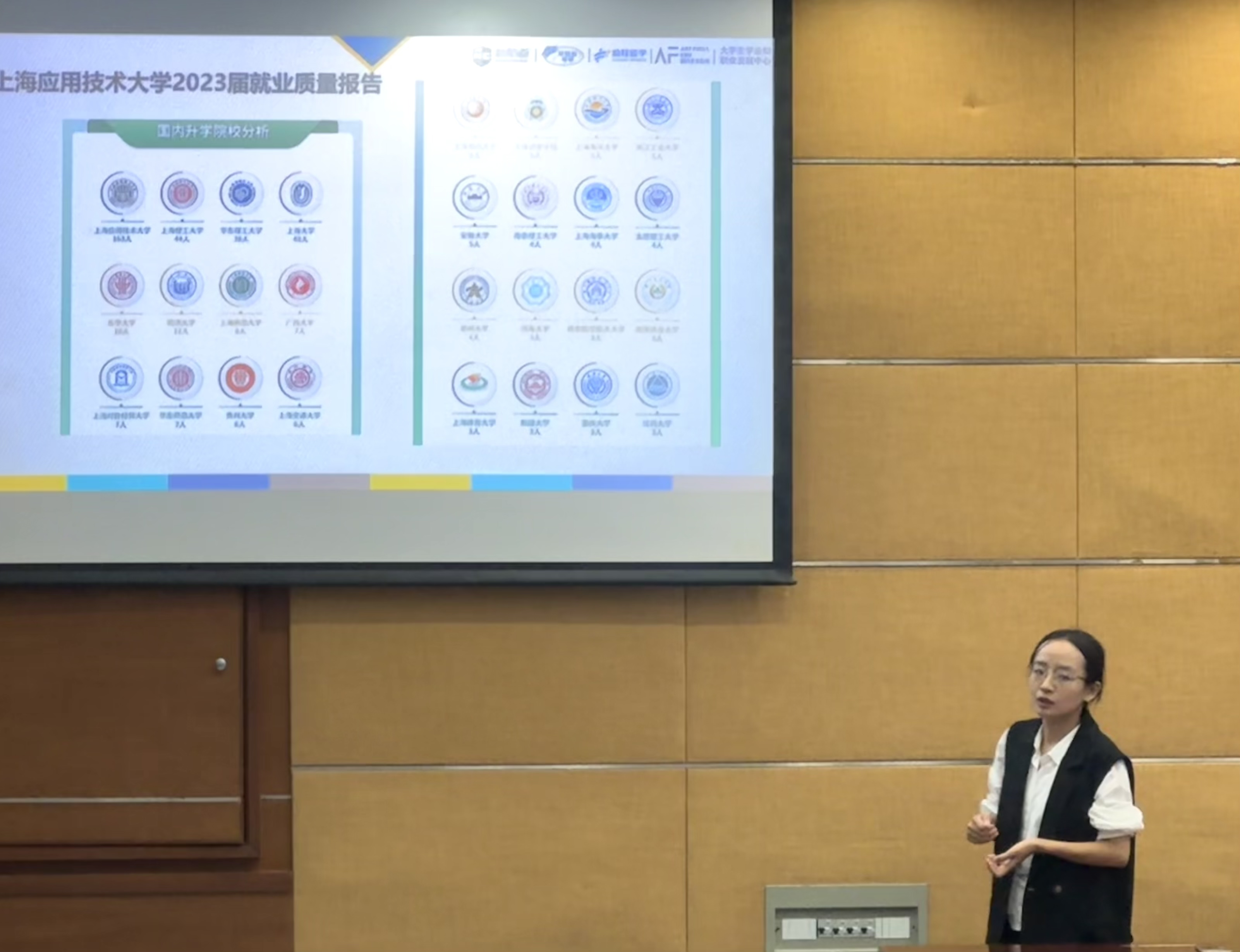 张丹老师从高校就业形势分析、国内考研趋势分析、海外留学申请趋势分析、考研和留学双规划这四个方面带来分享。首先,张丹老师以上海985、211院校升学情况进行介绍,包含国内升学率、海外升学率和整体深造率三个板块。接着根据我校2023届就业质量报告,清晰地呈现了各升学规划的比例数据,为同学们带来重要的就业数据参考。