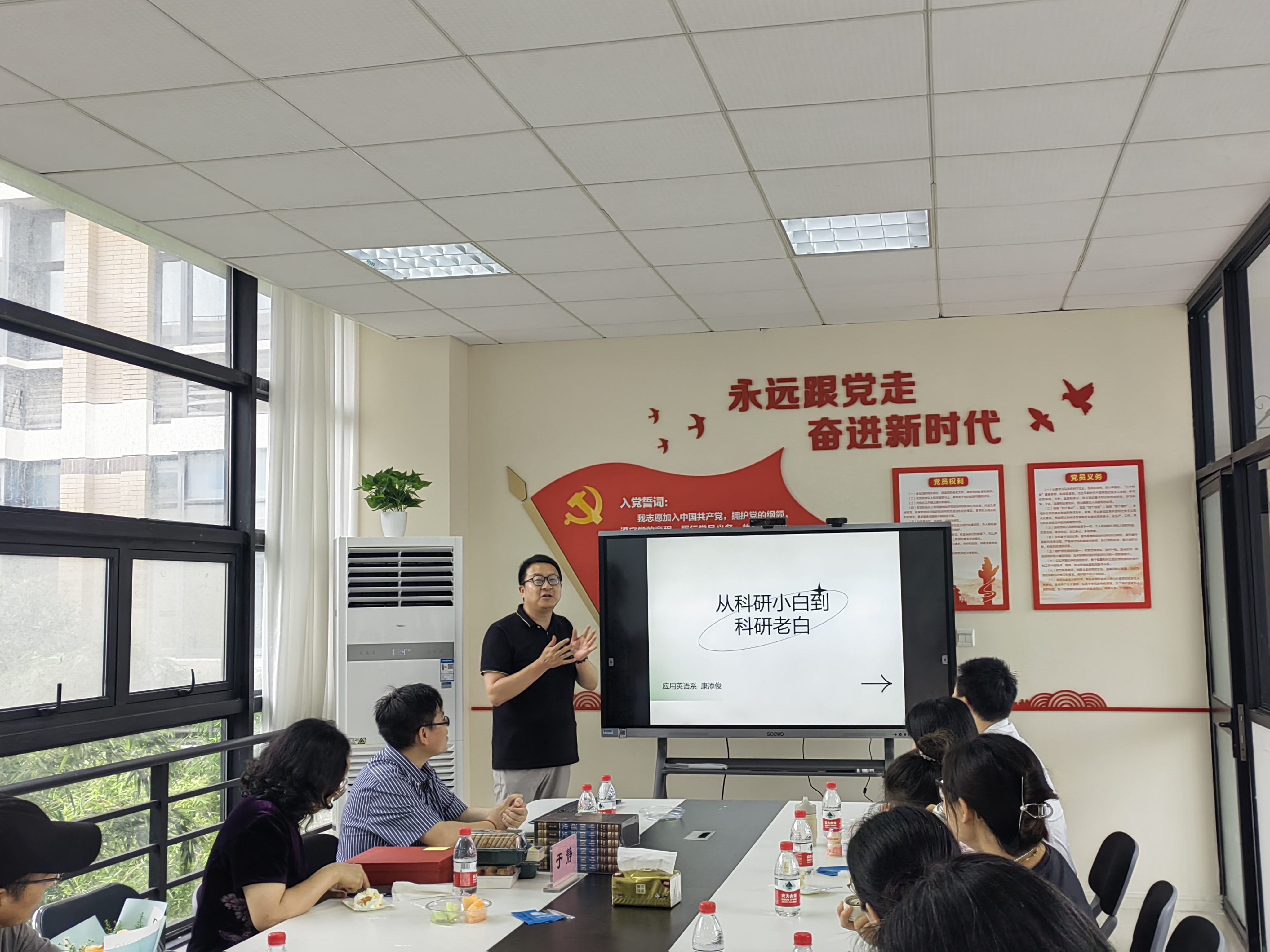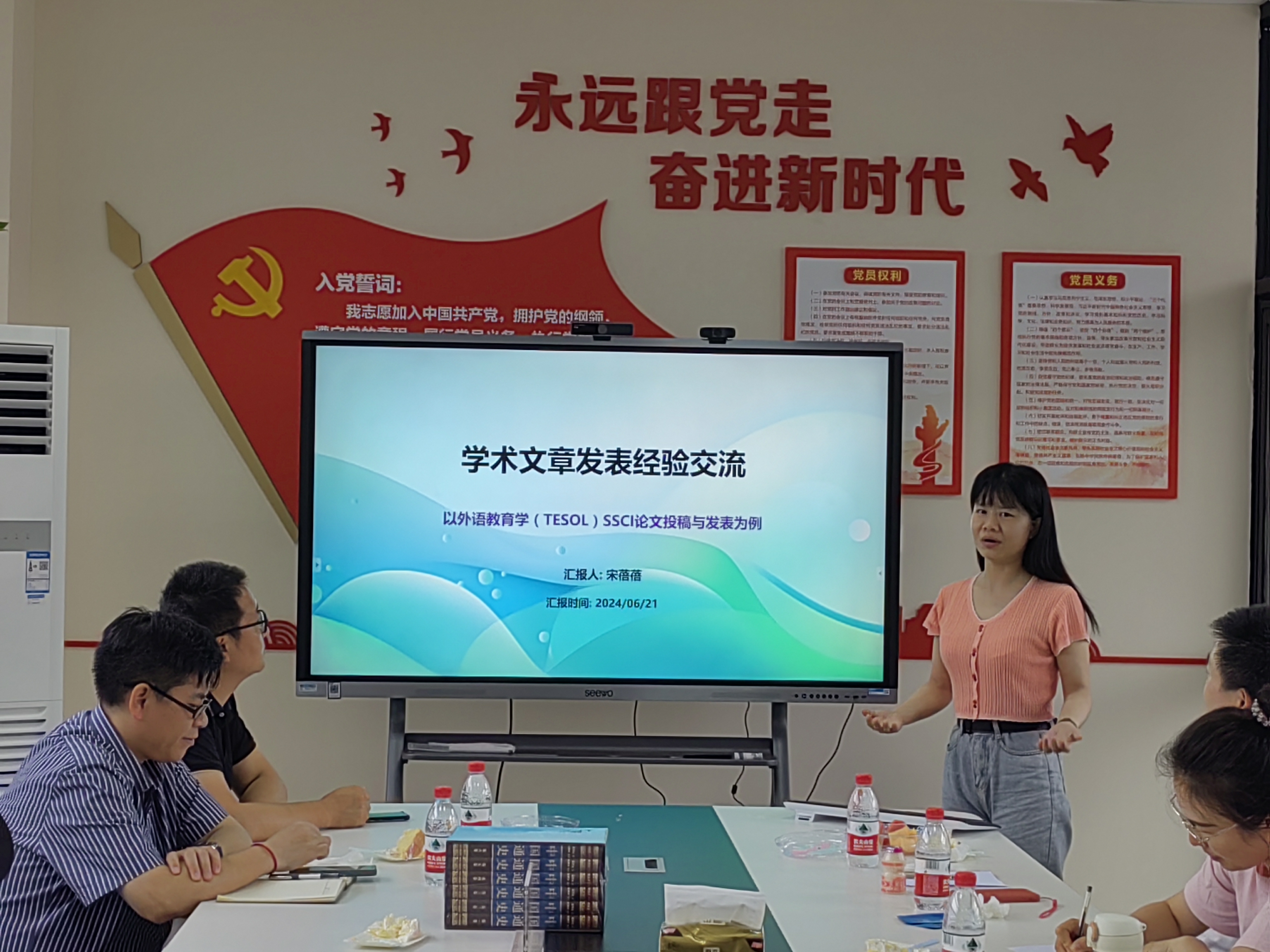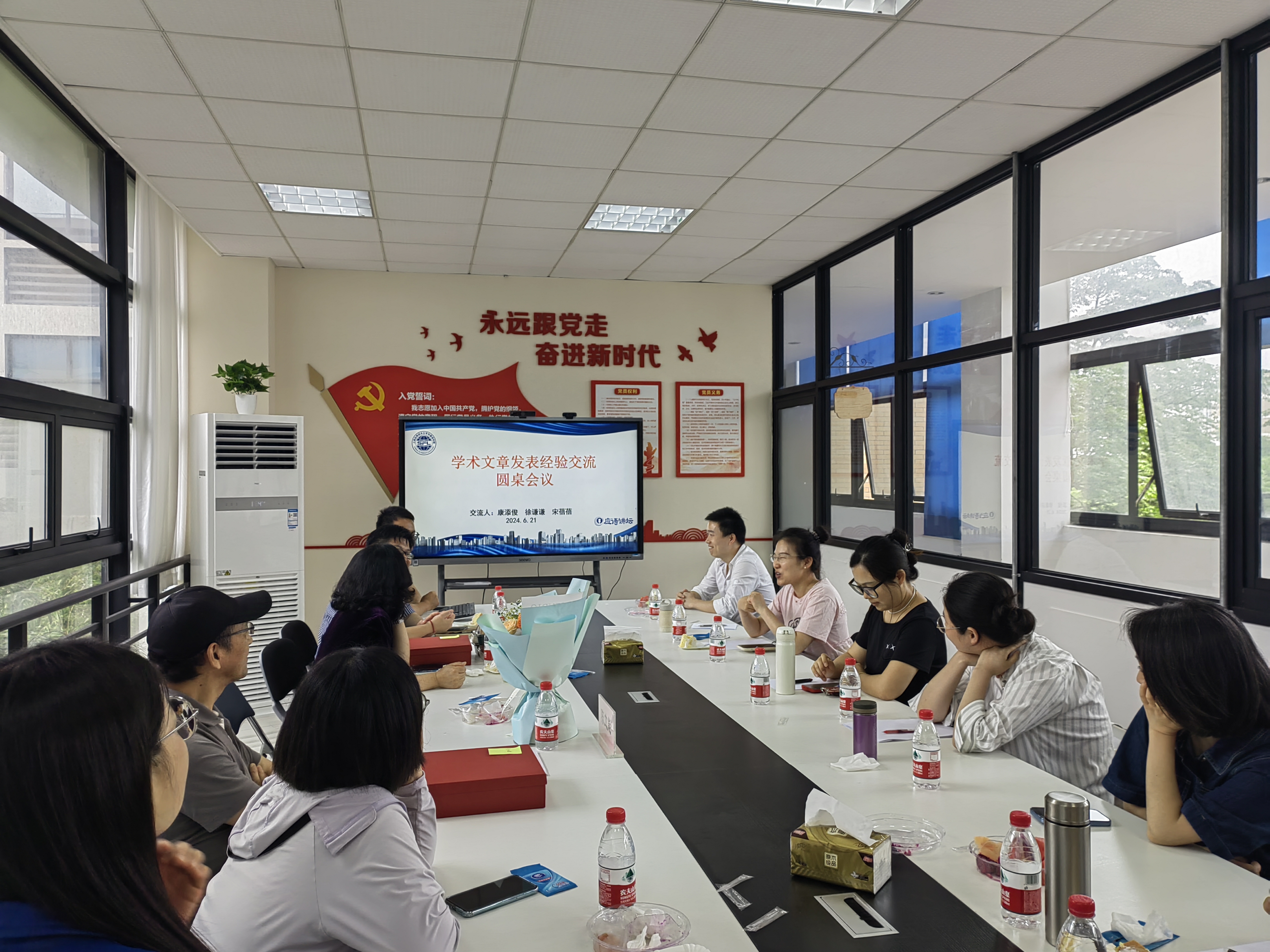 6月21日下午,外国语学院“应语讲坛”第十三讲在第五学科二楼多功能室开讲。本次交流会由学术文章团队组织,由团队召集人、德语系党支部书记徐琴琴主持,主题围绕学术期刊发表经验进行。英语系康添俊、徐谦谦和宋蓓蓓三位老师主讲,十多名老师踊跃参与交流对谈。