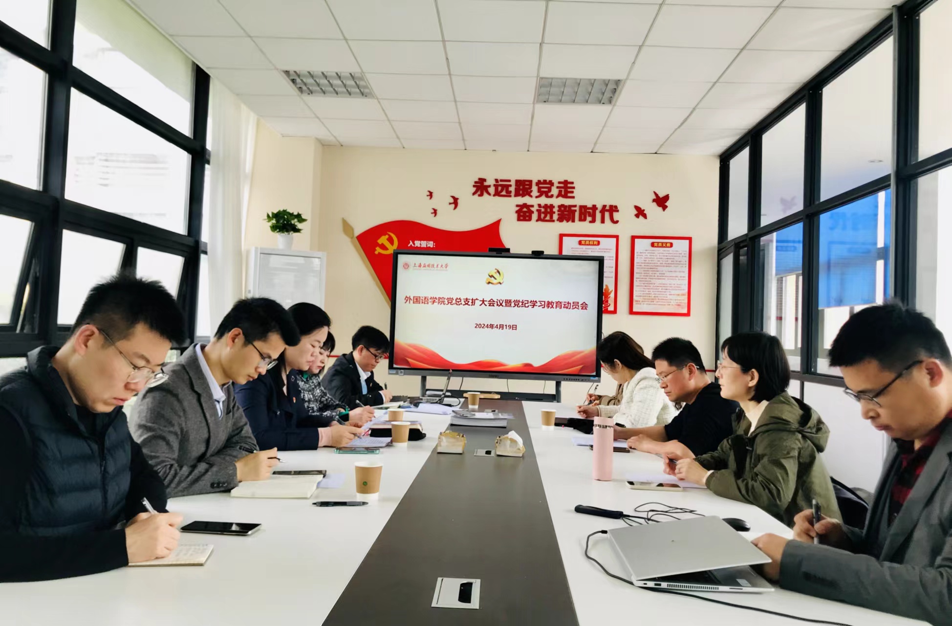 4月19日,外国语学院召开党总支扩大会议暨党纪学习教育动员会,学习贯彻习近平总书记关于开展党纪学习教育的重要讲话和重要指示精神、《中共中央办公厅关于在全党开展党纪学习教育的通知》及相关文件精神,传达学校党委党纪学习教育动员部署会精神,对学院党纪学习教育进行动员安排。学院党总支书记杨雪作动员讲话并提出实施计划,学院领导班子、党总支委员、全体党支部书记参会。