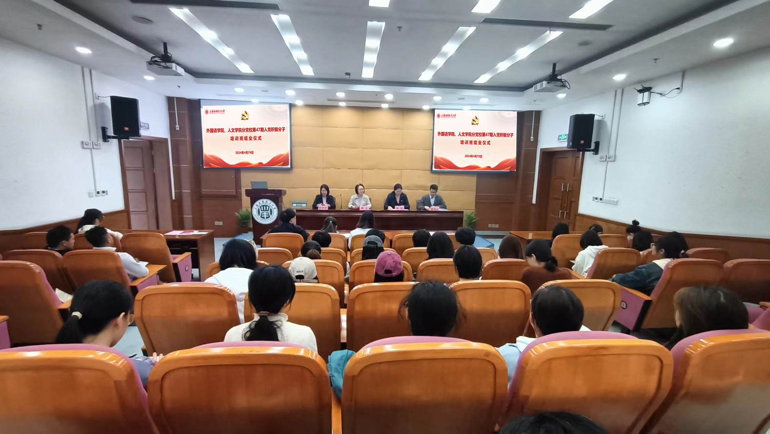 4月19日下午,由外国语学院与人文学院联合举办的分党校第47期入党积极分子培训班结业仪式在图书馆B102报告厅举行。人文学院党总支书记周文,外国语学院党总支书记杨雪,人文学院党总支副书记、副院长徐津津,外国语学院党总支副书记、副院长周雄才出席结业仪式。会议由周雄才主持。