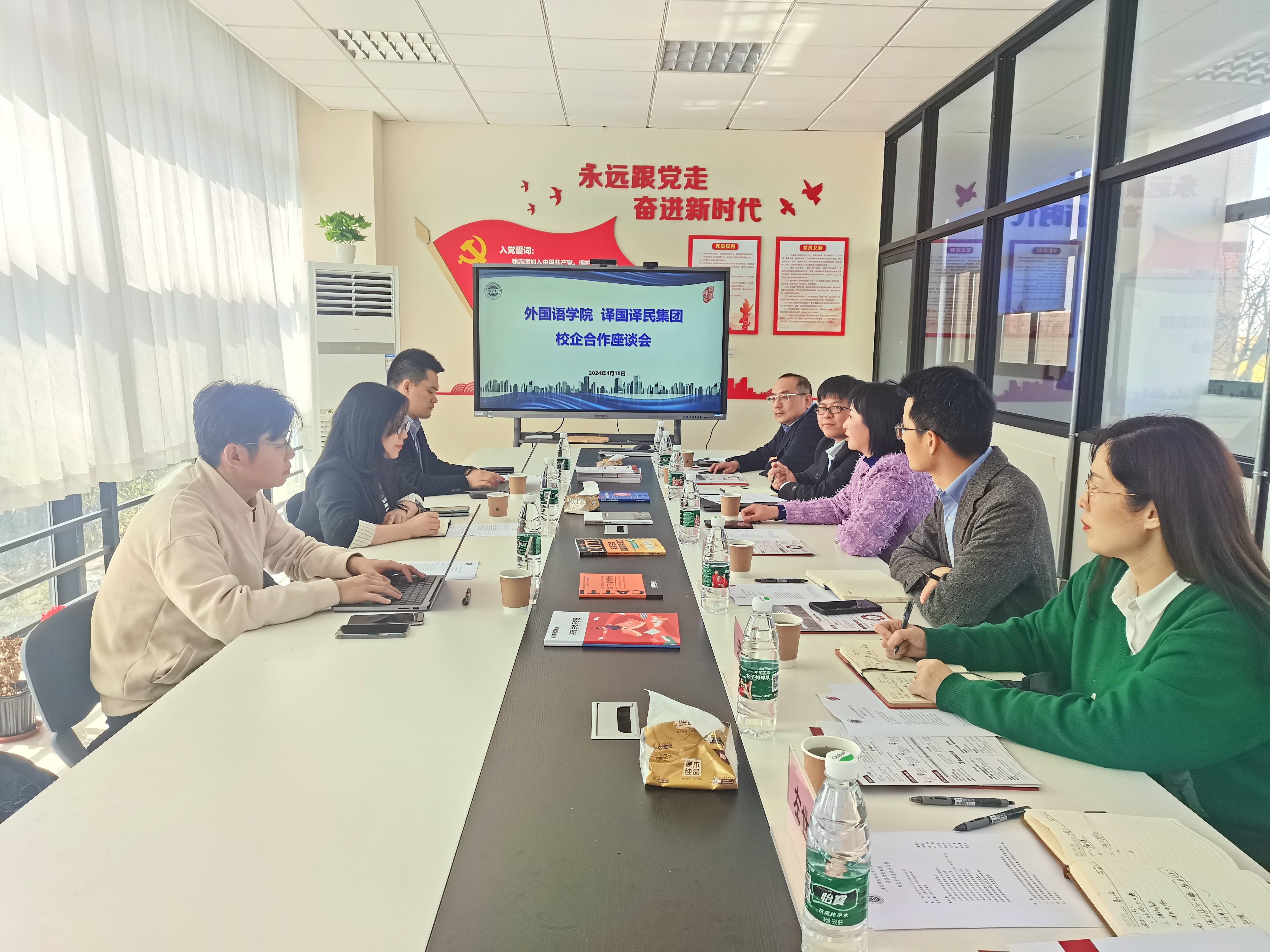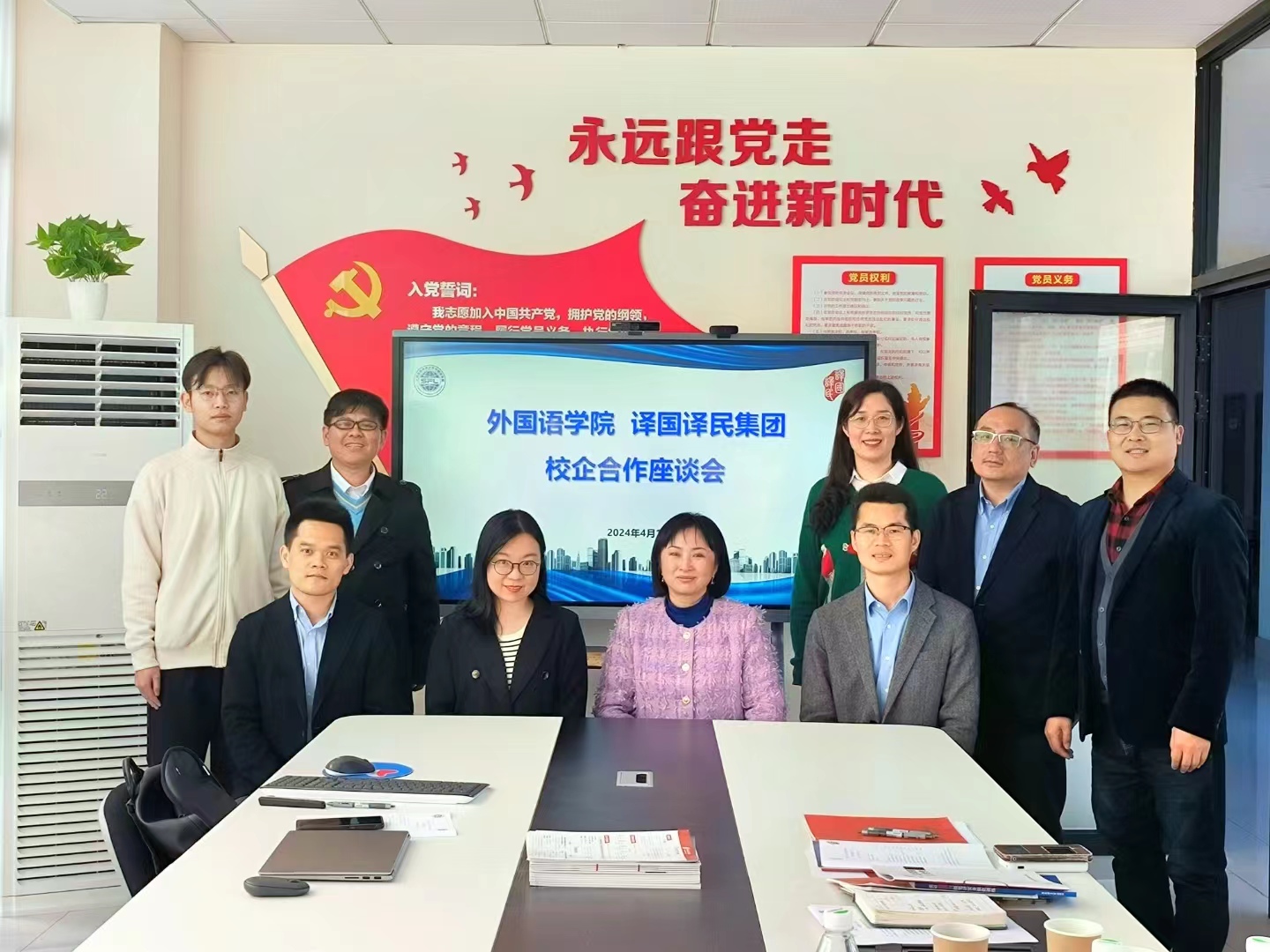 为促进校企合作,推动就业工作,加强应用型外语人才培养,4月18日下午,外国语学院与译国译民集团洽谈校企合作座谈会。外国语学院院长潘智丹,党总支副书记、副院长周雄才,教学主管迟娟,科研主管叶湘,德语系主任吴声白,实验中心主任左世亮以及译国译民集团高校事业部经理郑莺、华东区域总监陈佐鹰、商务经理吴可文参加了座谈会。