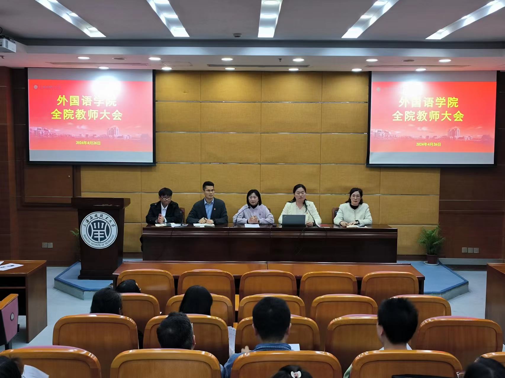 4月26日下午,外国语学院在图书馆B102会议室召开全院教职工大会。学院领导班子成员、全体教职工参加会议。会议由学院党总支书记杨雪主持。