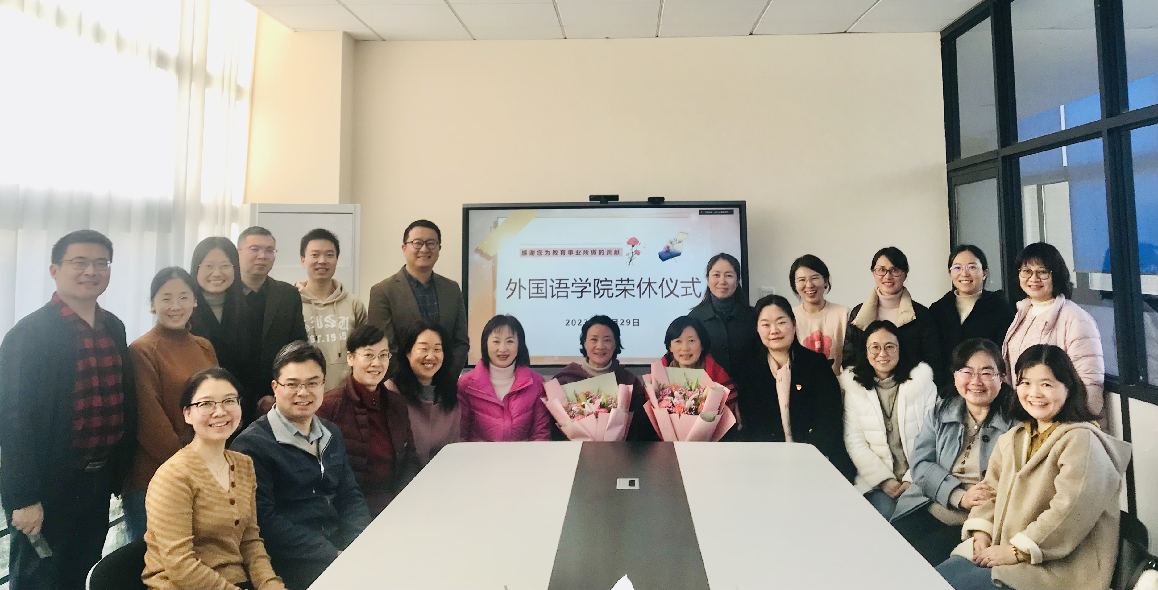 12月29日下午,外国语学院举办教职工荣休仪式。赵晓玲、怀佩炘、杨东胜和方华四位荣休教师,党总支书记杨雪、院长潘智丹及学院党政领导、各系、教研室负责人和办公室全体工作人员参加了荣休仪式,仪式由学院工会委员徐琴琴主持。
