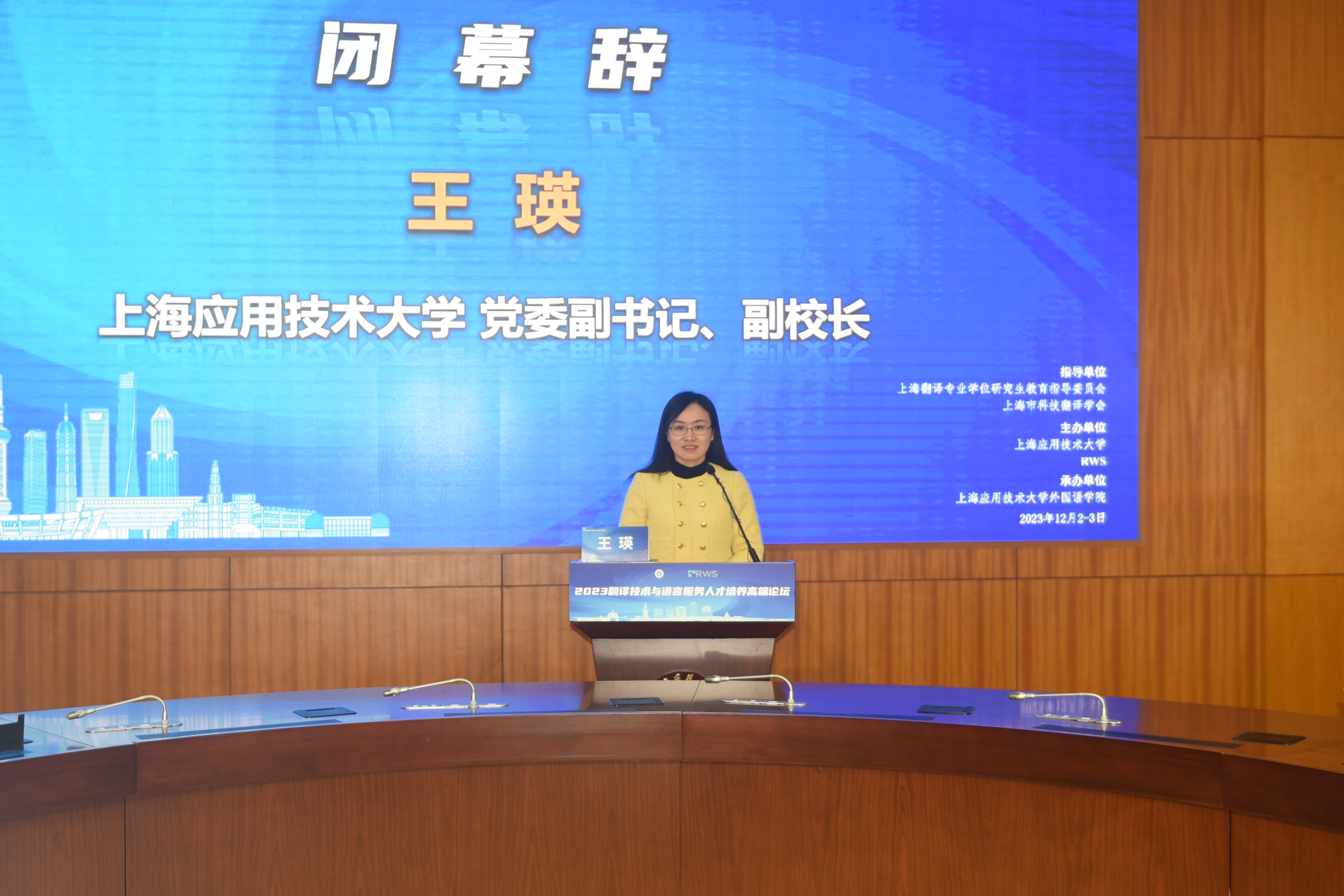 上海应用技术大学党委副书记、副校长王瑛致闭幕词。她指出,外国语学院承办的两届翻译技术与语言服务人才培养高端论坛已成为翻译学界沟通前沿翻译技术的新高地,海内外翻译教育界和语言服务行业打造应用型人才的新名片,践行产教融合、培养高水平应用创新型人才的新窗口。