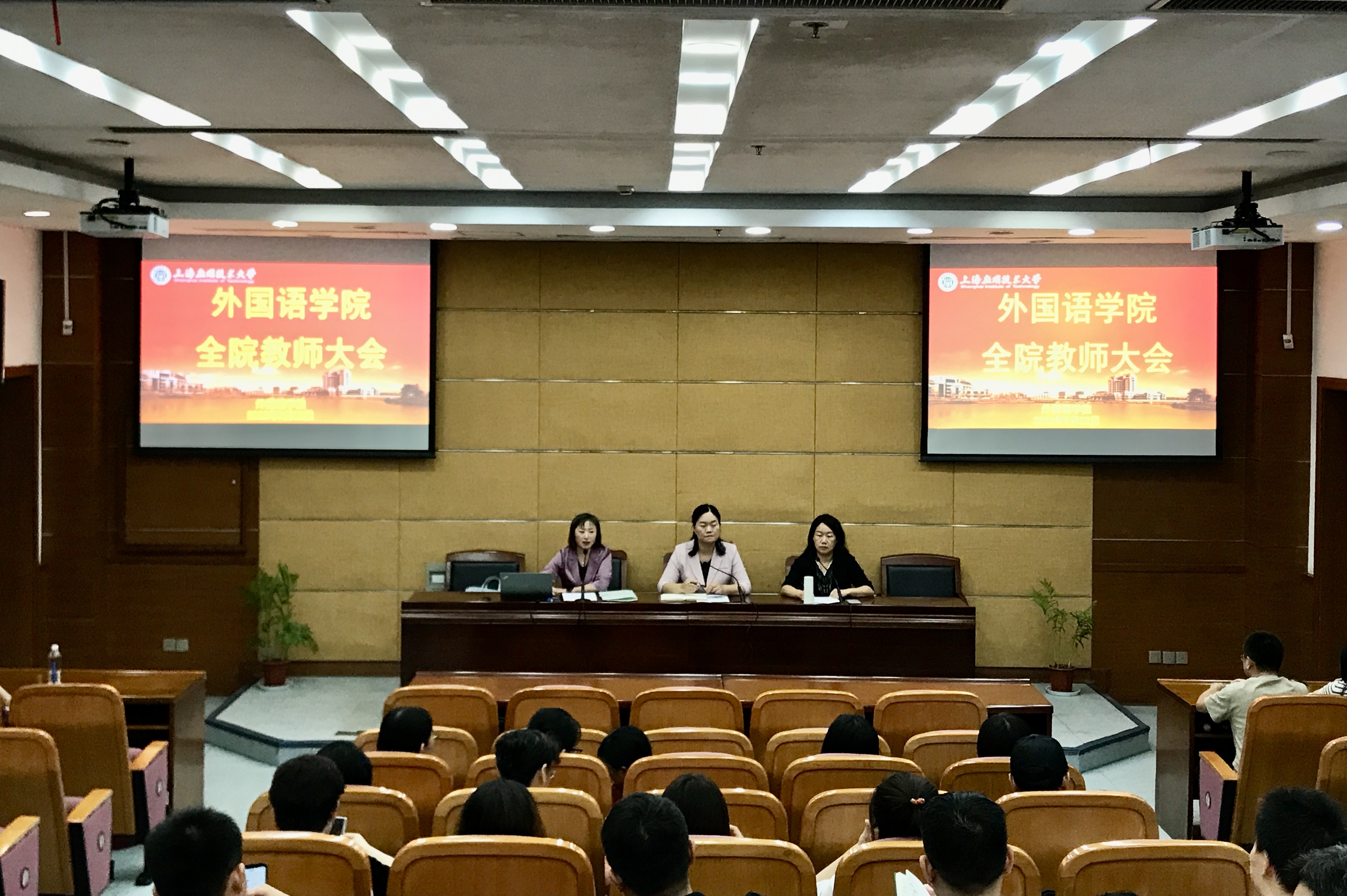 院长潘智丹首先对上学期以及暑期开展的重点工作进行总结,同时对学院学科建设、六大学术团队建设、教学工作、人才培养、科研工作、人才引进、双师培养等几大方面的重点工作进行了安排和部署。副院长金丽华就分管的学生工作中的就业、迎新及学生思想学习等重点方面进行了汇报。党总支书记杨雪对外语学院开展主题教育的相关情况进行了总结和报告,同时对本学期学院开展的师德师风教育、工会工作、安全稳定工作等方面进行了安排,尤其是对近期安全稳定工作提出了新要求。