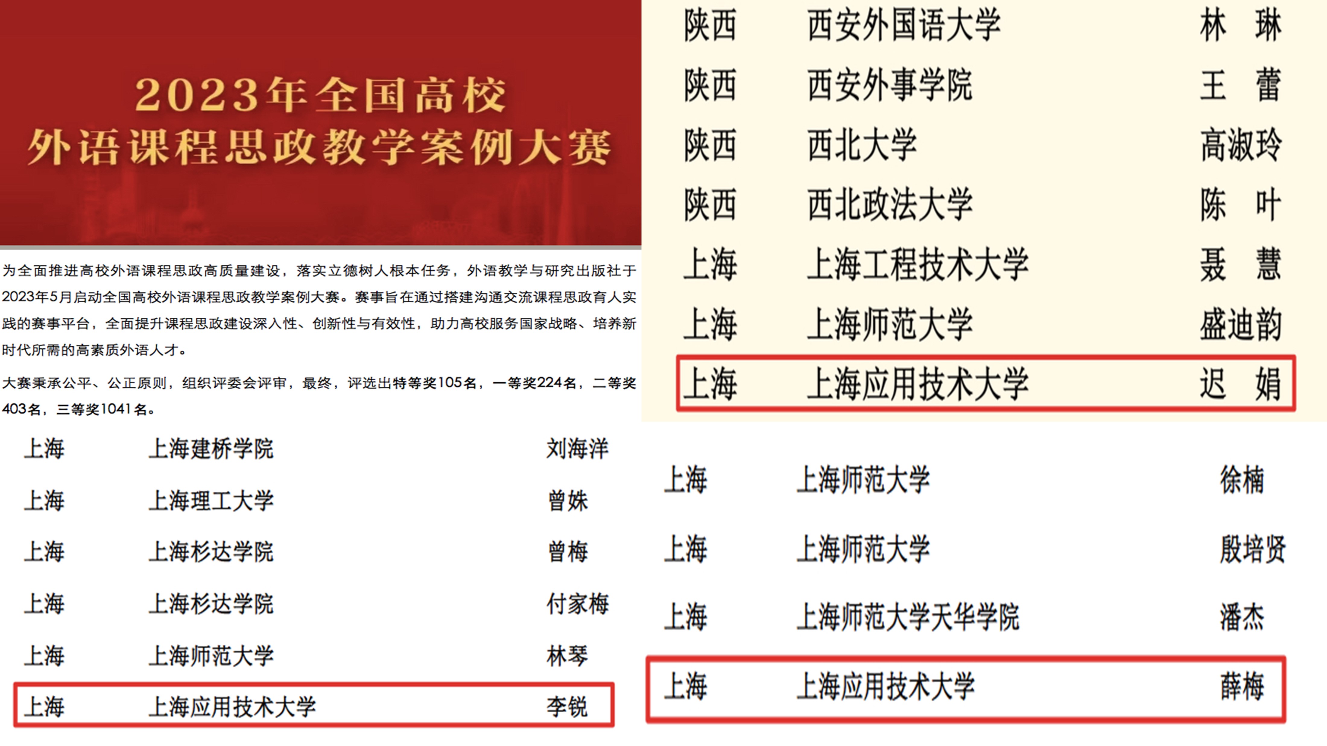10月8日,2023年全国高校外语课程思政教学案例大赛落下帷幕。我校外国语学院迟娟、李锐和薛梅三位老师教师秉承初心,精心备赛,紧扣我校育人目标和学科特色,积极探索外语课程思政育人新路径,以创新的设计理念和过硬的业务本领,从来自全国1773份教学案例中脱颖而出,其中,迟娟荣获该项赛事特等奖(特等奖上海地区高校仅3名),李锐获二等奖、薛梅获三等奖。