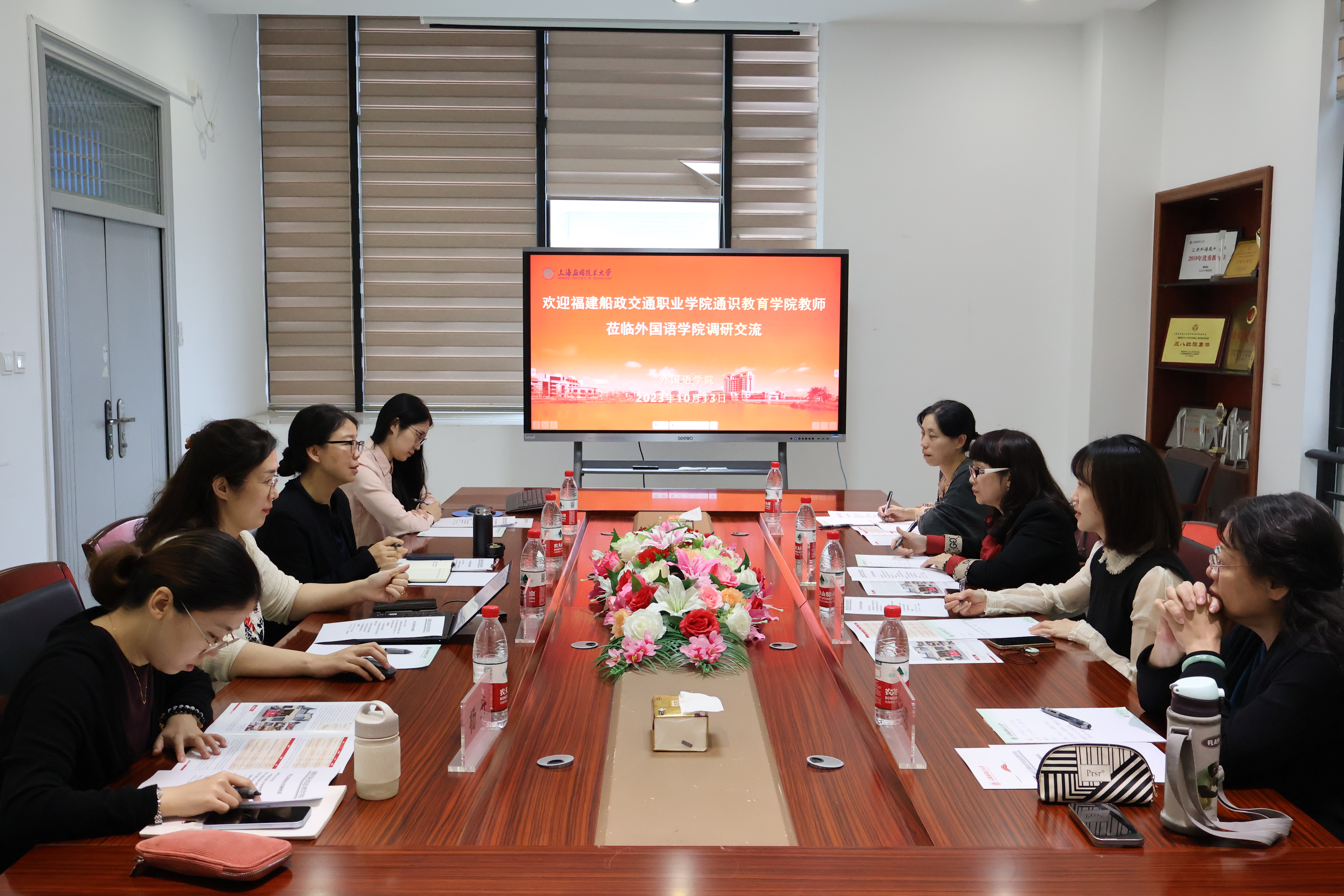 2023年10月13日上午,福建船政交通职业学院通识教育学院英语教研室副主任吴菲菲、梁华蓉教授一行四人到我院开展调研学习。外国语学院公共英语教研部主任迟娟、魏兰及副主任杨卉、徐晗出席座谈。