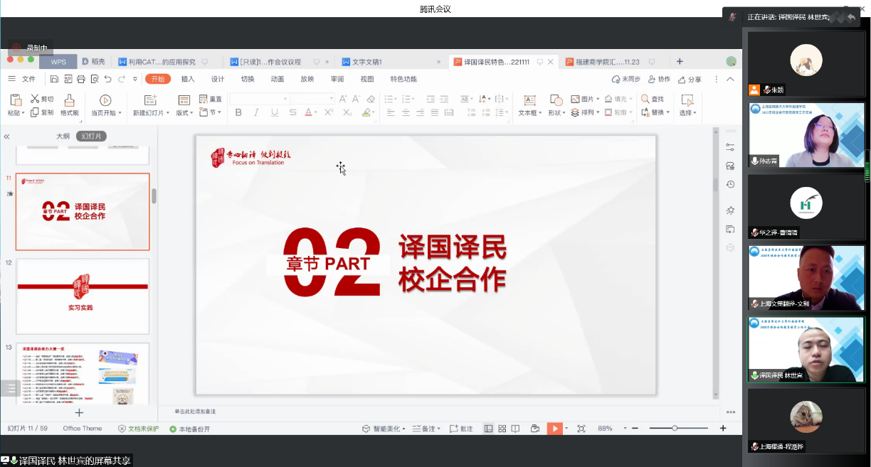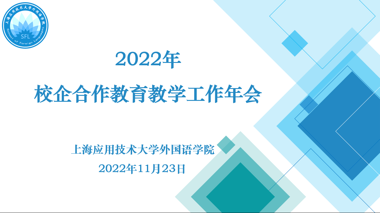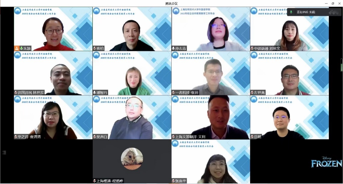 11月23日,外国语学院通过腾讯会议举办了2022年校企合作教育教学年会。上海华之译信息科技有限公司、上海樱通翻译服务有限公司、上海译国译民翻译服务有限公司、中译语通信息科技(上海)有限公司、上海文策翻译有限公司、上海一者信息科技有限公司共六家公司代表应邀出席会议,外国语学院院长潘智丹、副院长孙志青和各系部主任参加会议。副院长孙志青主持会议。