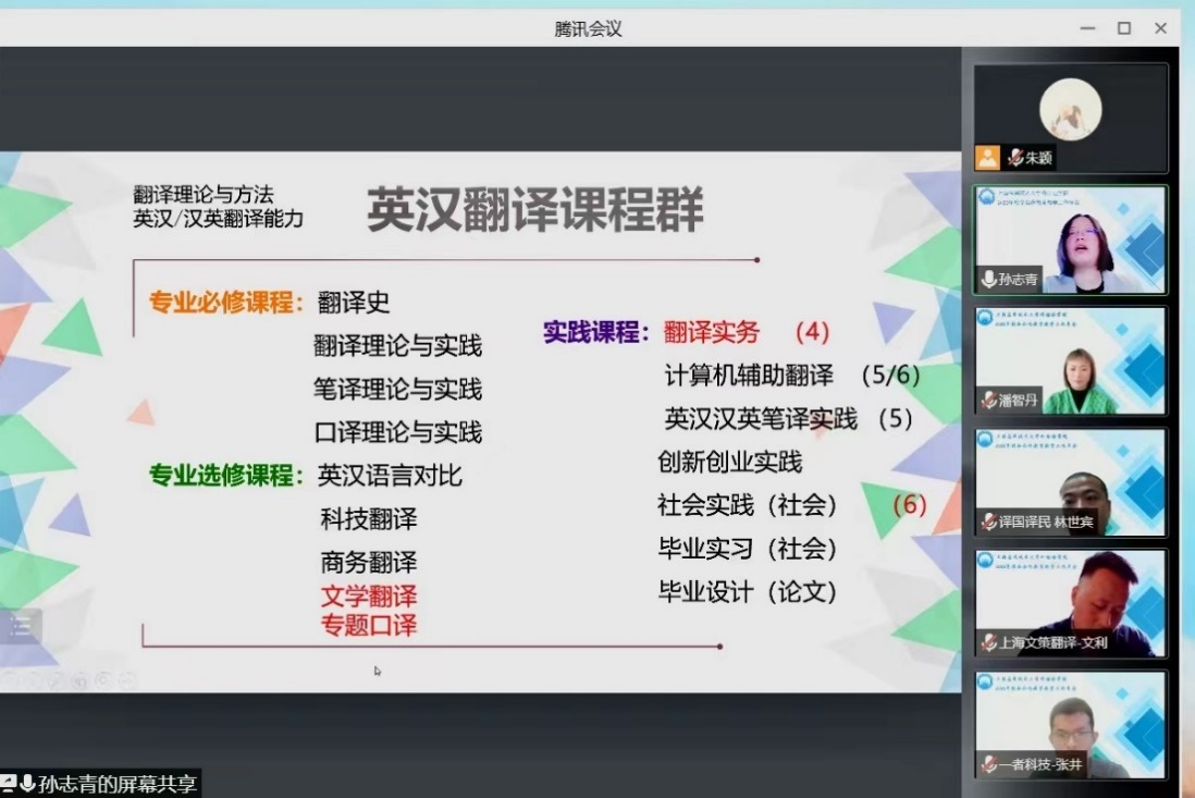 孙志青介绍了外国语学院的师资结构、翻译类课程群的课程设置、翻译师资建设,以及企业的合作愿景。重点从课程建设、实习实践和毕业设计三方面剖析了与企业的合作切合点,希望与会企业更多地参与引企入教等课程建设,给学生提供更多实习实践机会。