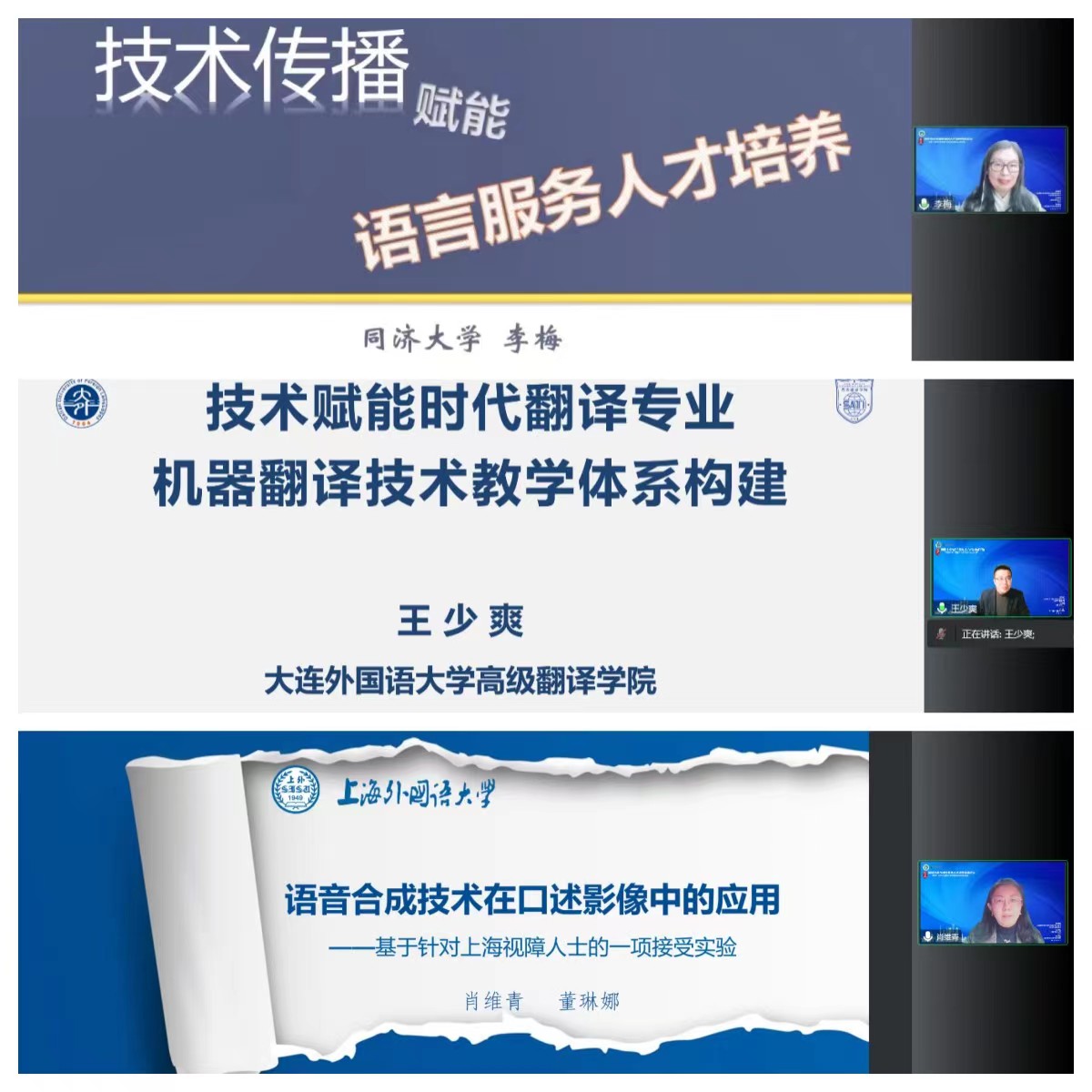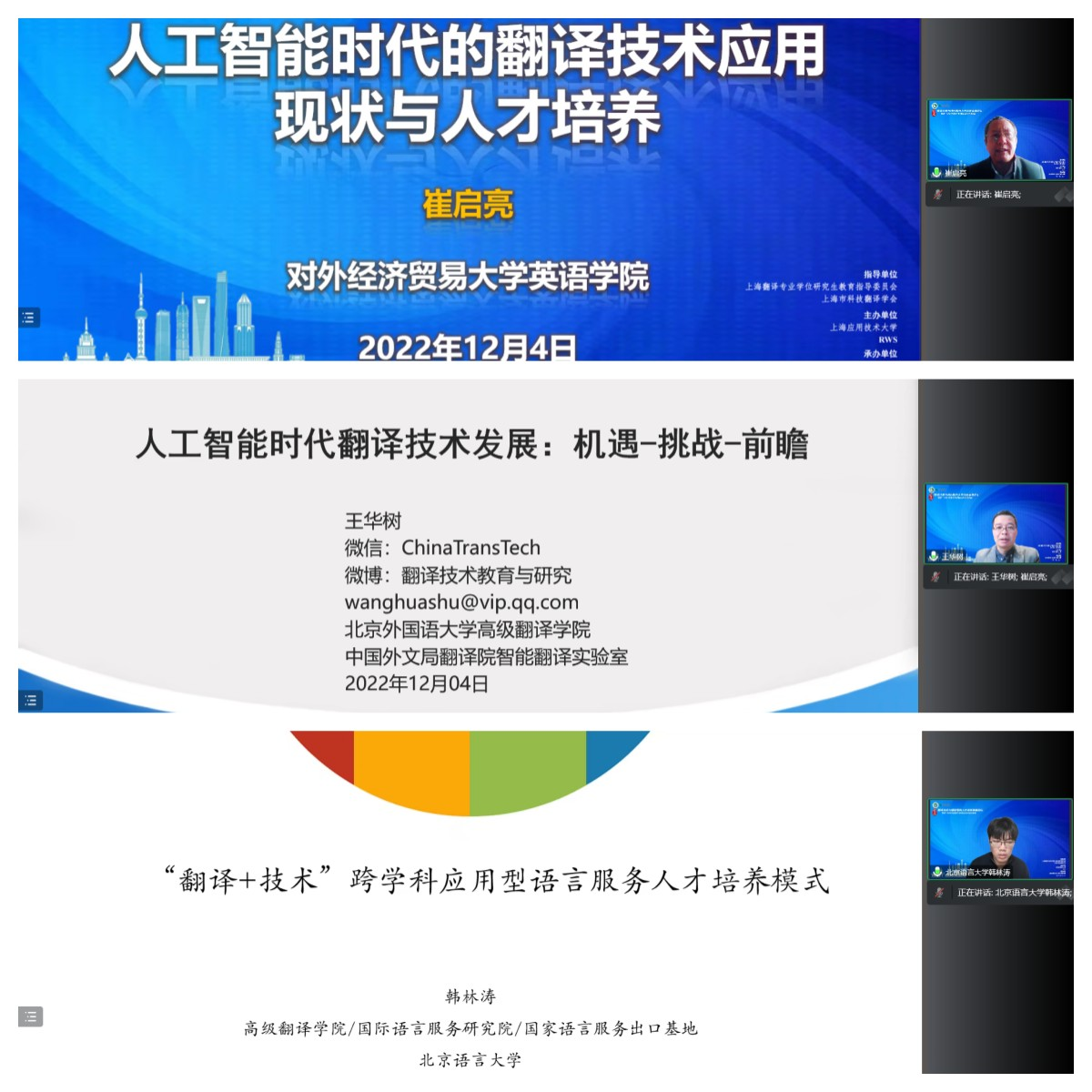对外经济贸易大学崔启亮副教授、北京外国语大学王华树副教授和北京语言大学韩林涛老师,多维度分享了人工智能时代翻译技术的现状、发展趋势、机遇挑战和前景,“翻译+技术”跨学科应用型语言服务人才培养模式的形成路径、核心内容及应用效果。